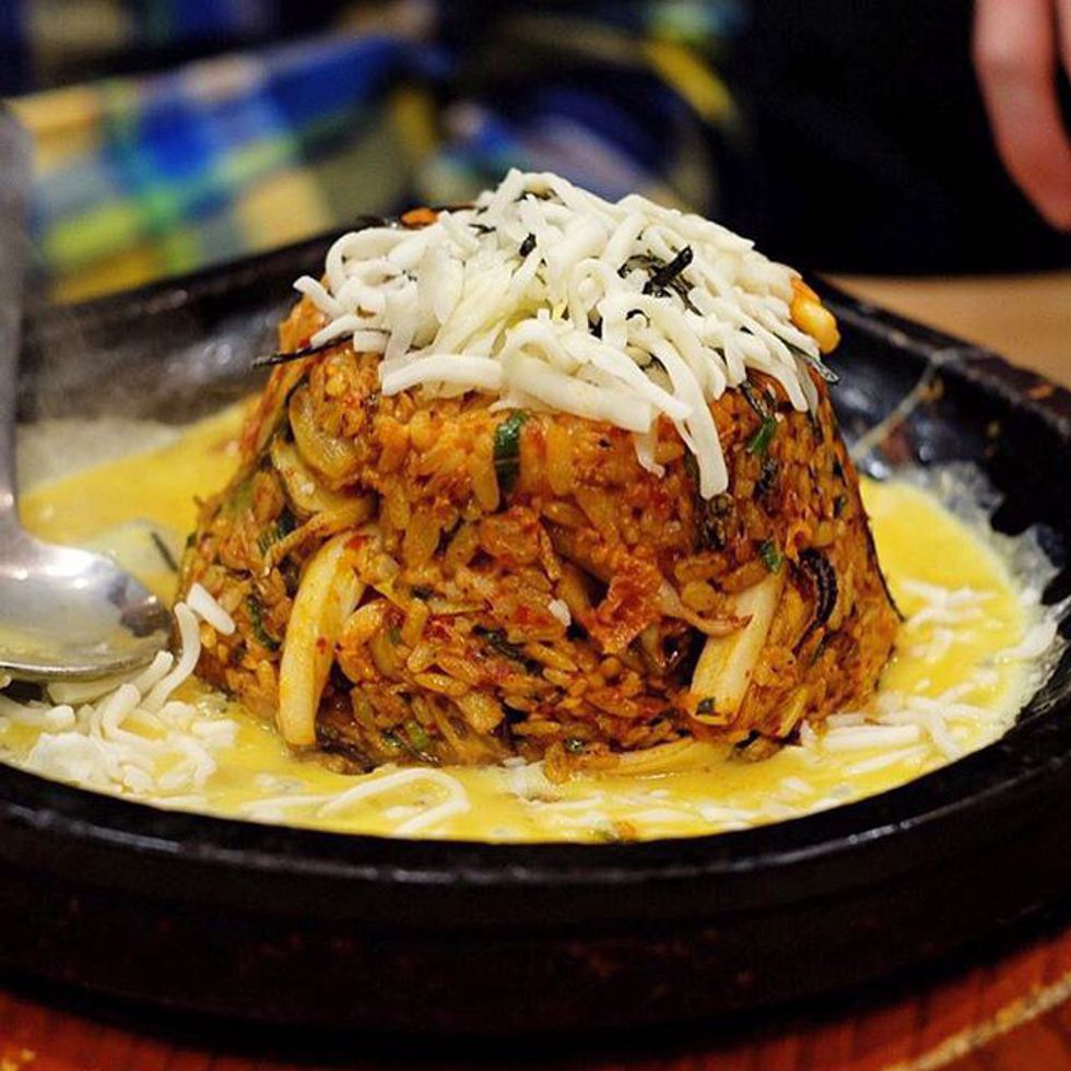 There’s a fine restaurant in Koreatown called Five Senses, whose specialty dish is Dol Pan Kimchi Bokum Bap: kimchi fried rice with beaten eggs poured freshly onto its simmering plate, stirred to allow the shredded mozzarella cheese to melt into the crevices of the spicy jasmine rice mountain.