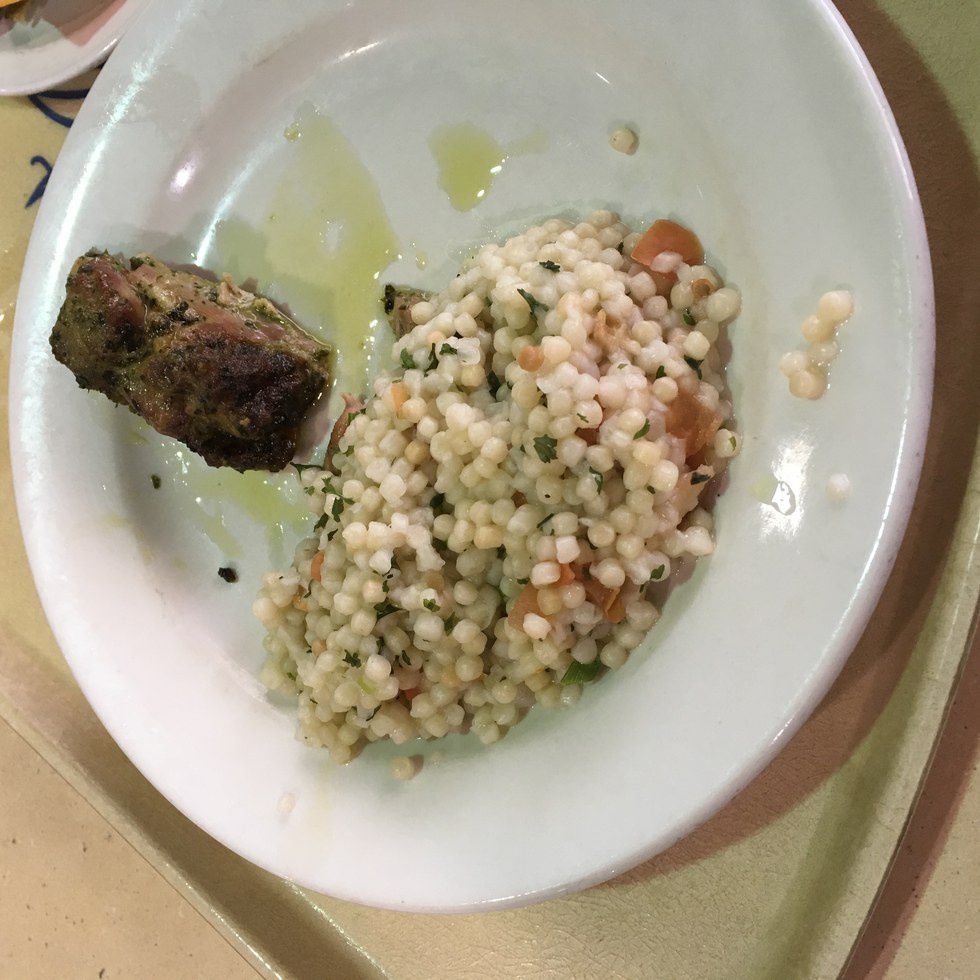 So finally something great came out of my lunch as I tried couscous. Before trying this, I really had no idea what it was and saw it as just an unfamiliar side dish. I was delightfully surprised when I took my fist bite, especially since the only starches I usually eat are potatoes and I have never been a big tomato fan. Couscous is pretty good and I know the next time it is offered; I will be putting some on my plate. My Review: 8/10 will eat again and will remind myself that that I liked it the first time I tried it. Note: I did not eat the pork on the plate because it was very undercooked but again ate another sandwich.