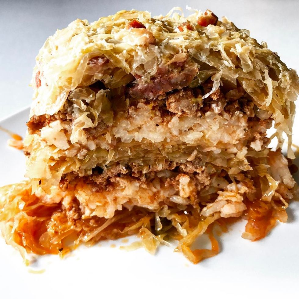 This dish is a true spin on one's idea of lasagna. In fact, there is absolutely no pasta in this dish. It simply consists of layered cabbage, meat, sour cream, rice and the optional sausage. DELICIOUS.