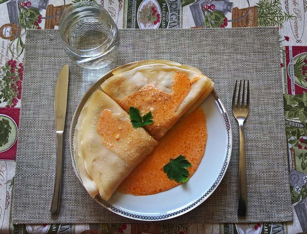 Crepes filled with Hungarian spiced chicken. Ah-Ma-Zing.