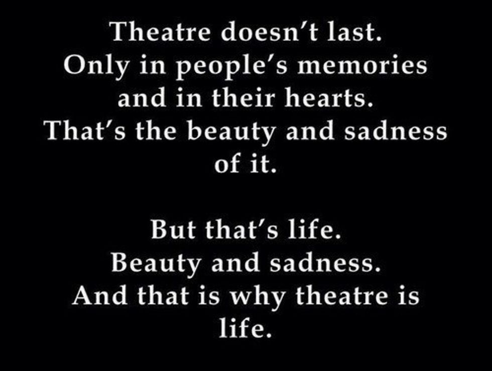 You leave everything you have on the stage because that is where you are most alive. Theatre and performing is an art, one that flows in and out of thespians like blood pumping in and out of the heart. Look into the eyes of a thespian when they talk about theatre, and you'll see the blaze of the fire it set in their soul. These feelings and desires can never be truly explained, only experienced. Emotions always run high, on and off the stage, here is a list of the five biggest feelings every thespian experiences.