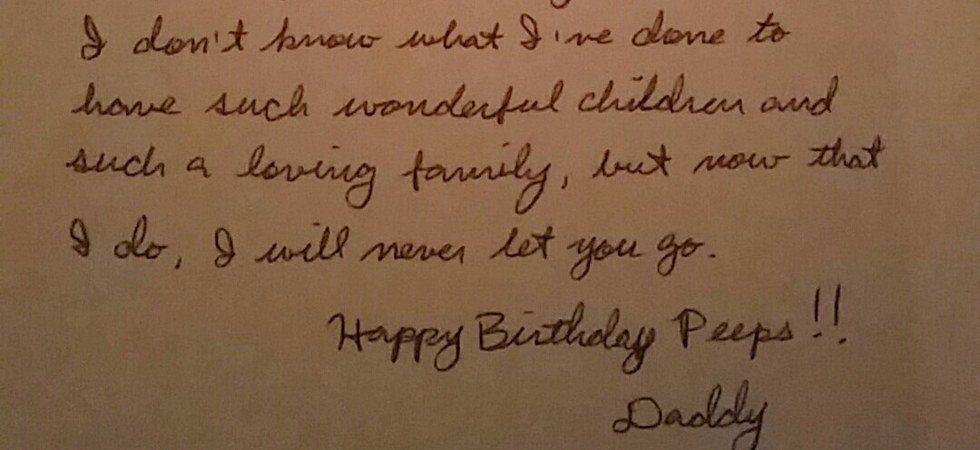 I found a card you gave me on my first birthday. You signed it, “I will never let you go.”
