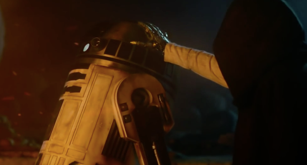 The second trailer however, gives us just enough tantalizing details to beg many questions. It opens with a voiceover, which has been confirmed to be Luke (Mark Hamill) himself repeating his line from Return of the Jedi, "The force is strong in my family. My father has it. I have it. My sister has it." However in this trailer, he tacks on an additional member, stating, "You have that power too." Then we are given our only (possible) visible evidence of Luke Skywalker's presence in the film--his assumed hand resting on R2D2.