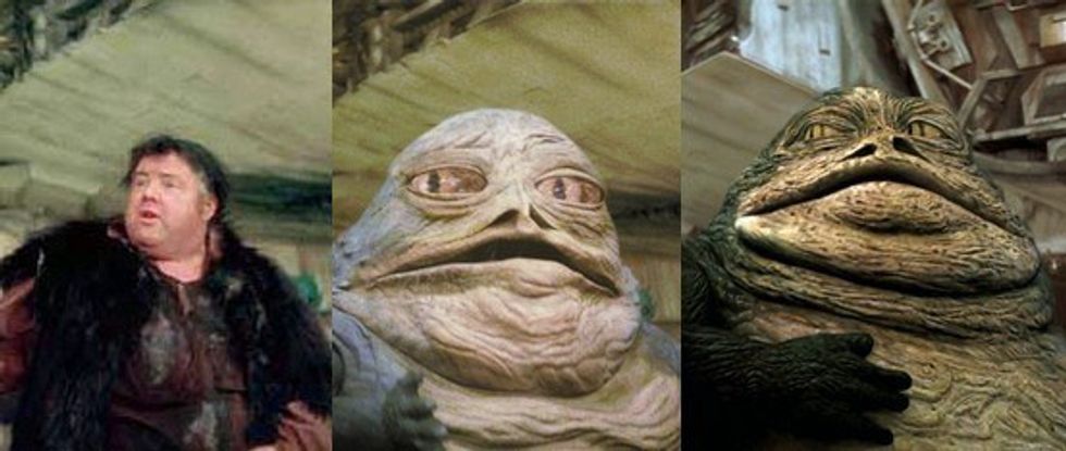 The reason for the inconsistency? Lucas actually wanted Jabba to look like an alien, but due to limitations back in the 70’s, digital effects for the character were not acceptable, and Lucas had to settle for a human-looking Jabba. The 1997 special edition and mid-2000s re-release of “Star Wars” feature the character with his slug-like appearance.