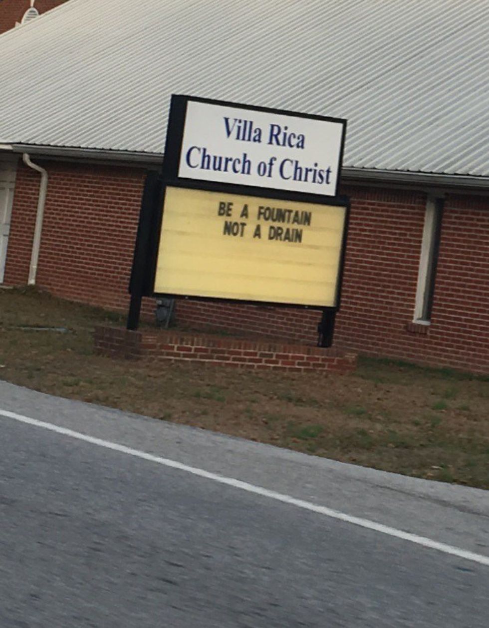 Every time I drive home from college, I pass by this small church. I never paid attention to it, until one evening. I believe in God's timing and this was definitely the moment he wanted me to notice the church sign. I was driving back to college from burying my grandfather. I had had a rough week and was ready to just go to sleep. As I was driving, I happened to get behind a car who was turning left into the church parking lot. This caused me to look over and see where the car was going. Instead, I happened to read the sign. The words on it have stuck with me for months. "Be a fountain, not a drain."