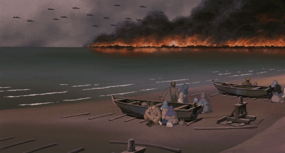 Grave of the Fireflies is another movie set during World War II, but on the other side of the world, Japan. The animated film begins with a boy named Seita and his younger sister Setsuko, who live with their mother. During the time of war, air raid sirens constantly go off as bomber planes fly above. Due to their mothers bad health, she leaves for a bomb shelter, leaving Seita to care for Setsuko. The bombs finally hit their city and the two lose their mother. They go to live at their aunts house Seita is put to work for rent, but it is not enough.
