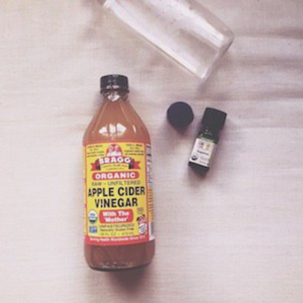 First, if you don't already have any, you'll need to purchase an organic apple cider vinegar. I love Bragg's unfiltered organic apple cider vinegar, which you can order online for pretty cheap or buy at any health foods store. Depending on the sensitivity of your skin, you're going to dilute the ACV. I usually go with one part ACV to three parts water, but you can adjust this until you find your perfect formula.