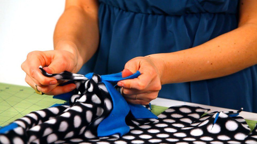 three-inch slits along the edges of both squares of fabric every other inch. Then, cut out the squares on each corner where the slits meet. - Once you are finished with all four sides, combine the two squares of fabric by tying knots between each cut piece.