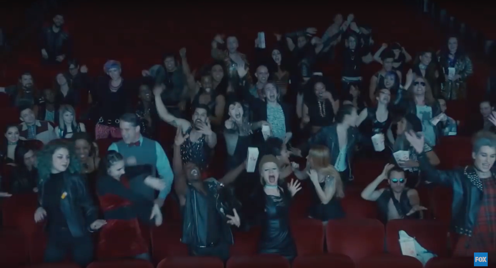 The beginning starts with the opening credit song, “Science Fiction Double Feature.” Ivy Levan does a very good rendition of the song. She alters it just enough to fit her vocals and keeps very traditional to the original, which I appreciate. She has very good control and body language while walking in, out, and around the theater setting. Her character references the original theater productions, when a singer in risqué Rocky Horror corset would come out, walk around the theatre, and do a strip tease while singing the song. Many traditionalist critics have been angered at the fact there was no strip tease, and in general the dumbed down sex of the film, but this is cable network television. There needs to be some reason. The fact that the setting is a theatre showing FOX’s version of the “The Rocky Horror Picture Show Movie” also brings in elements of the 40th anniversary. My only concern would be how everyone in the theatre is a punk rocker or like wise. A broader range of an audience, such as older folks that watched the original production or young "virgins" of the film. Fans are more than the outwardly strange these days; in fact, I feel like more fans come under the “looking normal” category, because it’s something new.