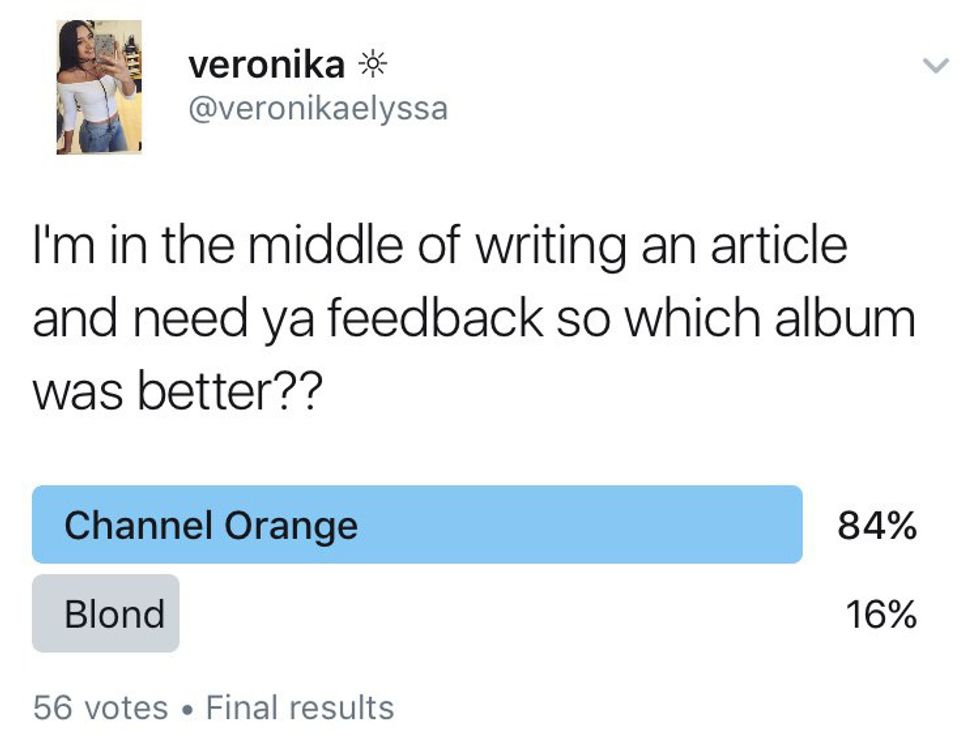 Alright so one of the biggest differences that I heard between "Channel Orange" and "Blond" was how much more simplistic "Blond" sounds rather than "Channel Orange". But this isn't necessarily a bad thing. "Channel Orange" was definitely an album that was so intricate with detail from metaphors Frank used to his purposeful skits. I felt more intrigued when listening to "Channel Orange" because Frank incorporated so many hidden messages about his sexuality and I feel that same goes for "Blond" but it just wasn't as clever as "Channel Orange." Frank was definitely feeling a lot more experimental with Blond and I think that's what some people weren't a fan of.