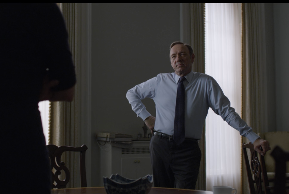 The very first line Frank delivered in the series, the Congressman from South Carolina certainly didn't waste anytime shedding his colours. Stroking a wounded dog before proceeding to suffocate it, this scene sent a shivering chill up the spines of the audience as it went on to establish the dark, sinister tone of the show. But it is also indicative of Underwood's nihilistically perverted moral compass, as he asserts to the audience that the only things worth keeping alive, or that deserve to live -- be they innocent of despicable -- are those that will be useful. Useful in fulfilling his designs.