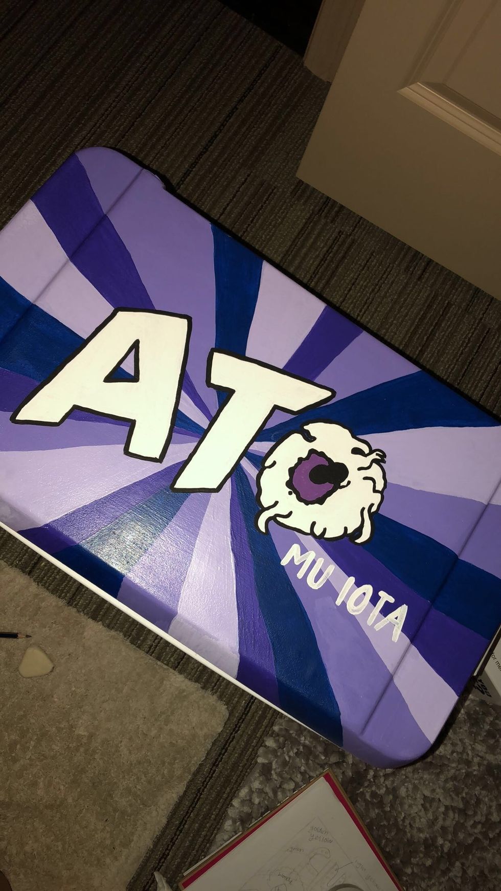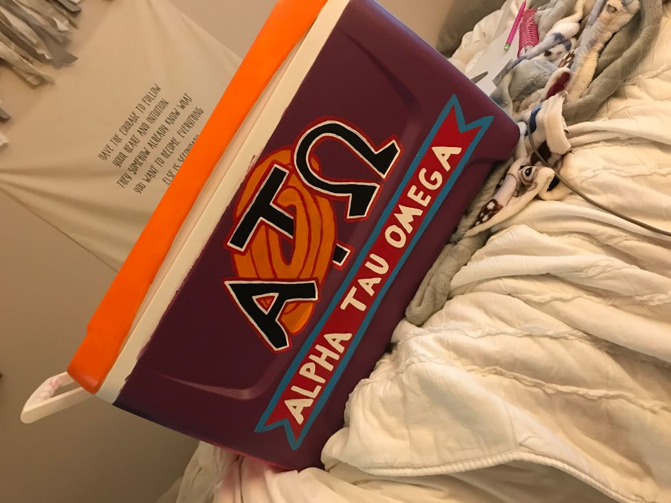 This side is actually taken straight from the Alpha Tau Omega Mu Iota fall 2017 rush shirt. I loved the design so much and had to have it as the focal point of his cooler. He designed that particular shirt, so I thought it was fitting to include his design on his cooler!