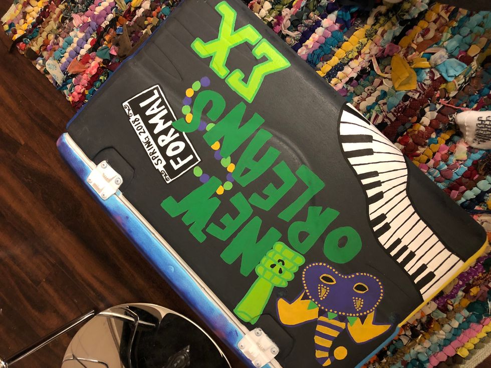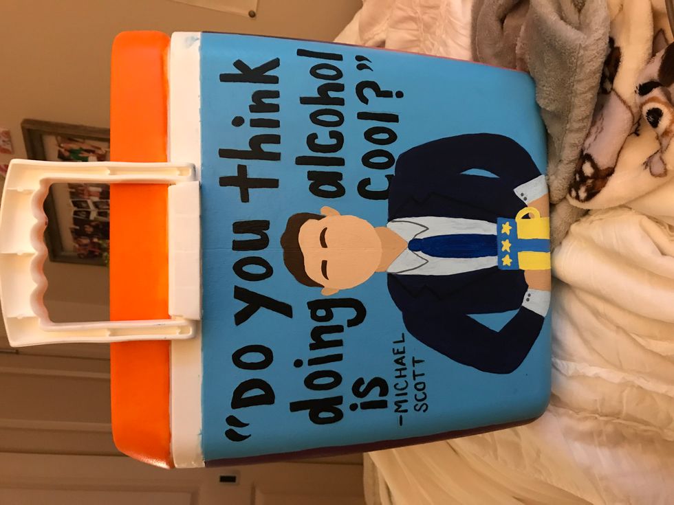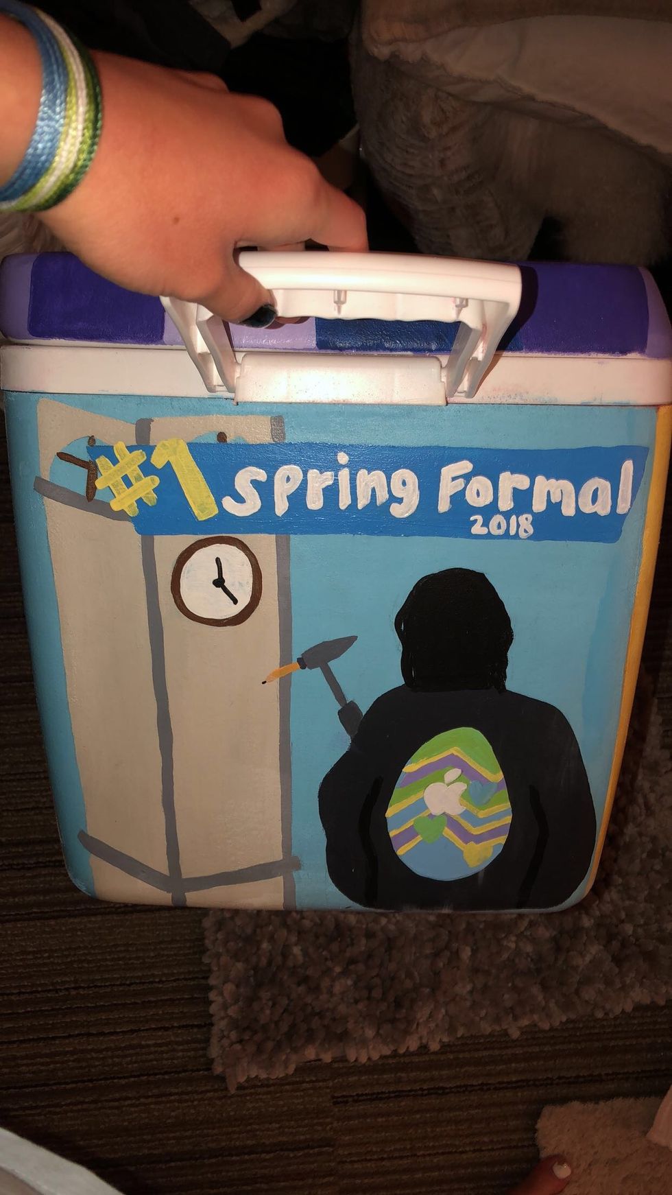This is the cooler I am most proud of and it is really special to me. I immediately knew what all I wanted to include on this particular cooler because I knew the guy very well at this point. It was our second formal together, so I wanted to do something special and make this one really personal! The front is straight from the music video for Walk It Talk It by Migos, and there are a lot of cool and colorful elements I got to include! I think it looks great.