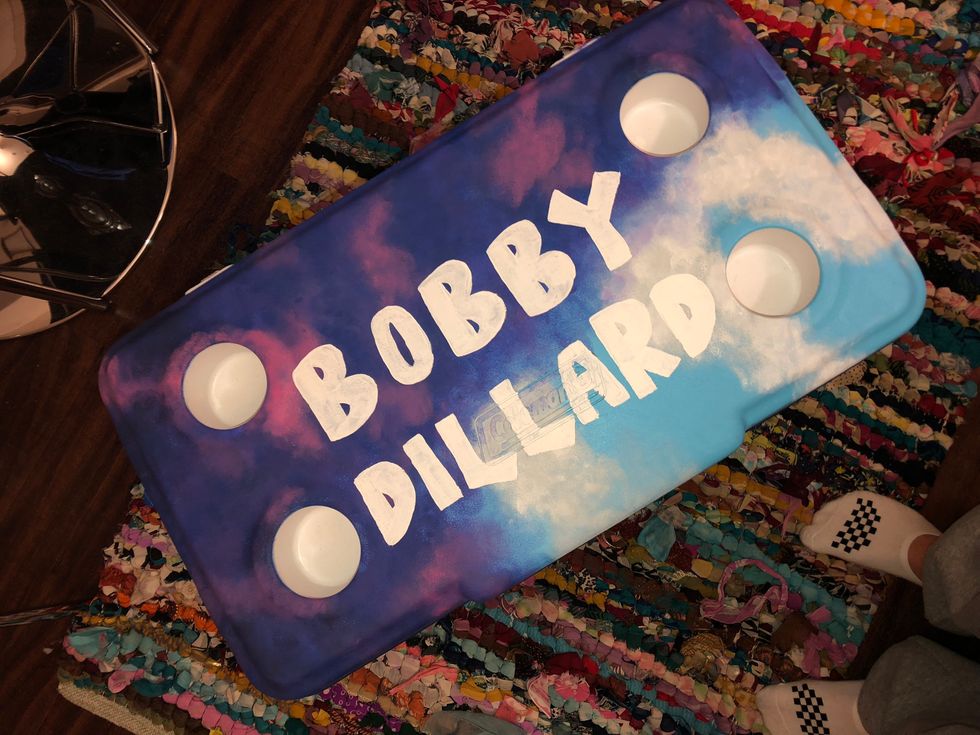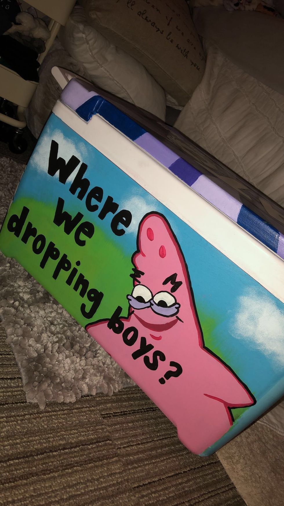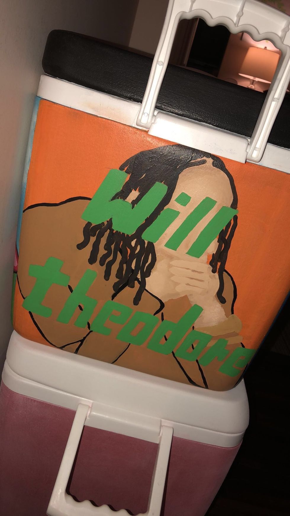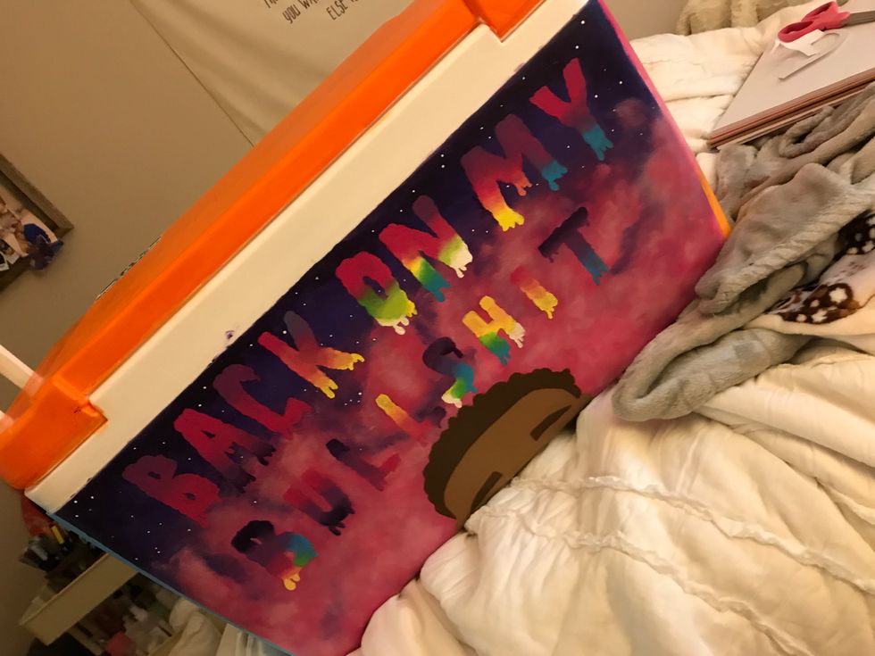 This side was my favorite to paint on the cooler. The clouds turned out amazing if I do say so myself, and the whole thing is so visually appealing to me. I combined his love for Chance the Rapper and the album Acid Rap and the infamous phrase on Twitter at the time "back on my bullshit".