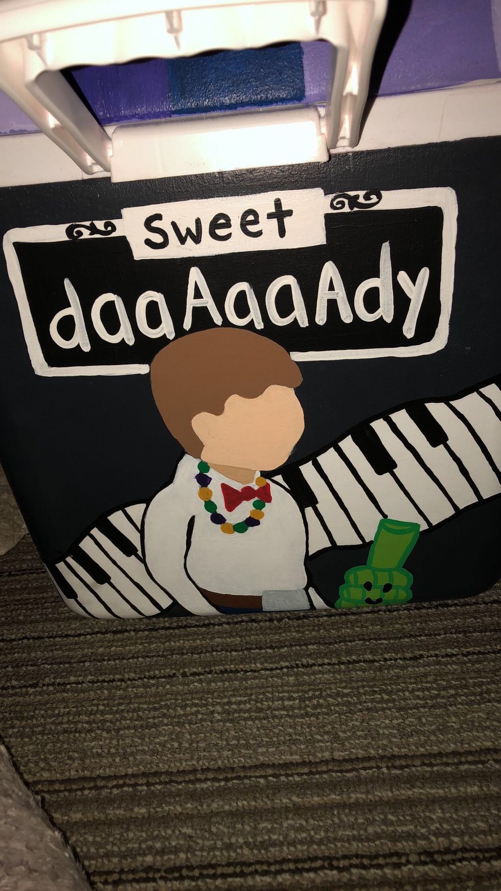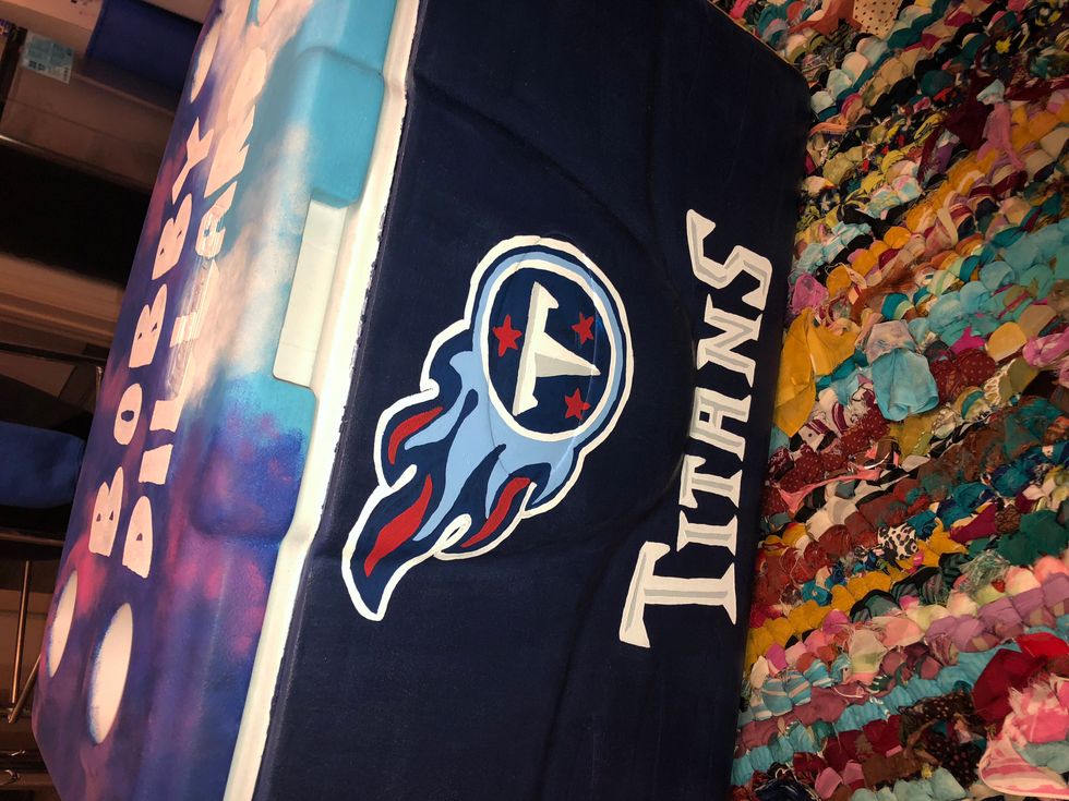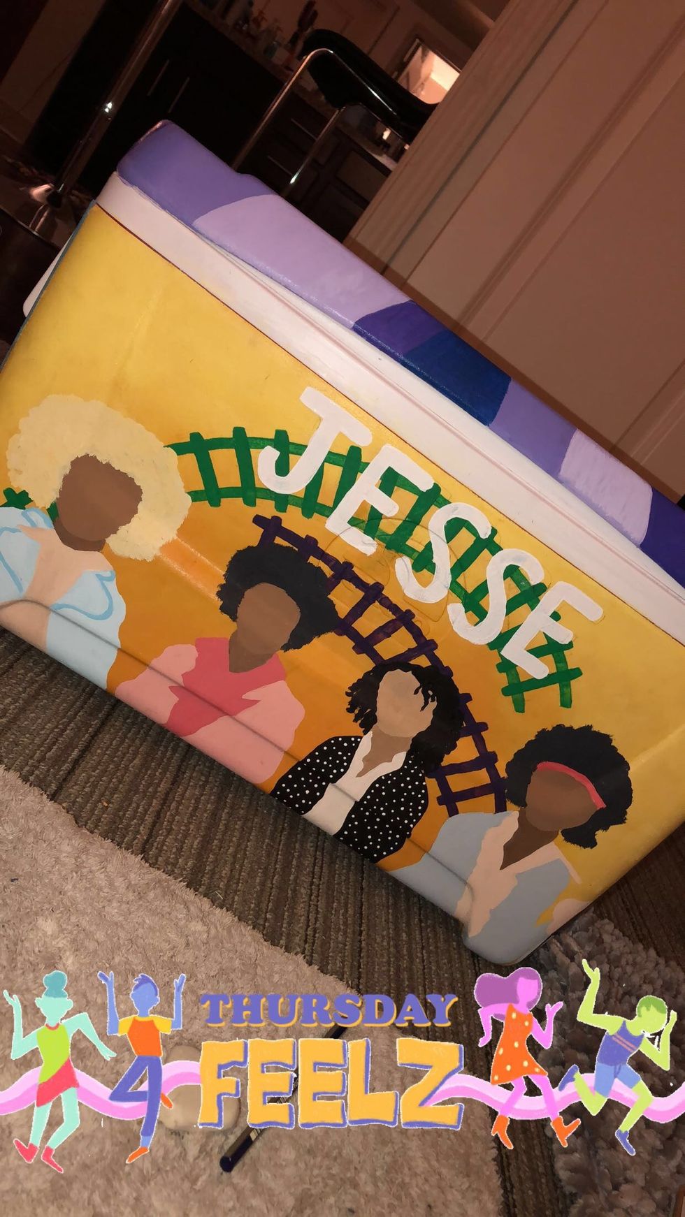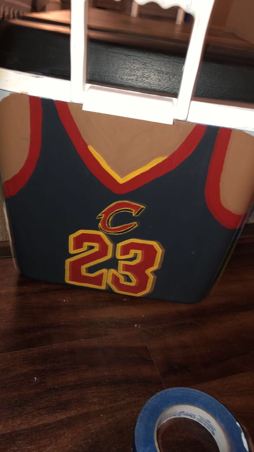 This side was my favorite to paint on the cooler. The clouds turned out amazing if I do say so myself, and the whole thing is so visually appealing to me. I combined his love for Chance the Rapper and the album Acid Rap and the infamous phrase on Twitter at the time "back on my bullshit".