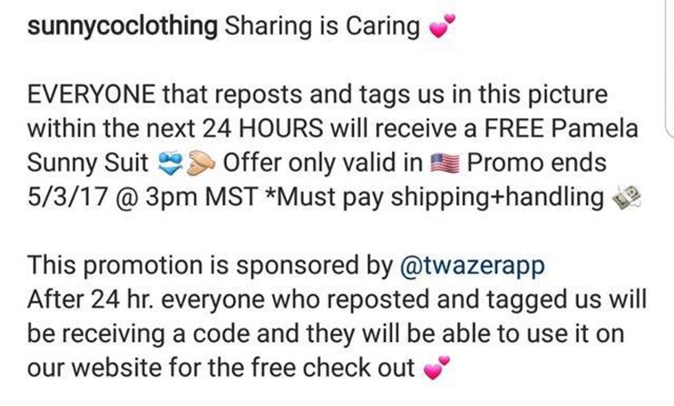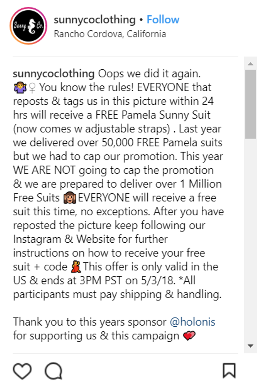 During May of 2017, Sunny Co Clothing announced that they would be giving away free $64.99 swimsuits for every person who reposted and liked the picture above on Instagram within 24 hours.