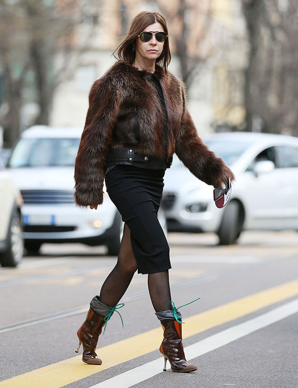 Editor-in-Chief of French Vogue and CR Fashion Book, Roitfeld mixes couture pieces with everyday clothing, depicting a new wave of femininity with pencil skirts, fur coats, and printed blouses.