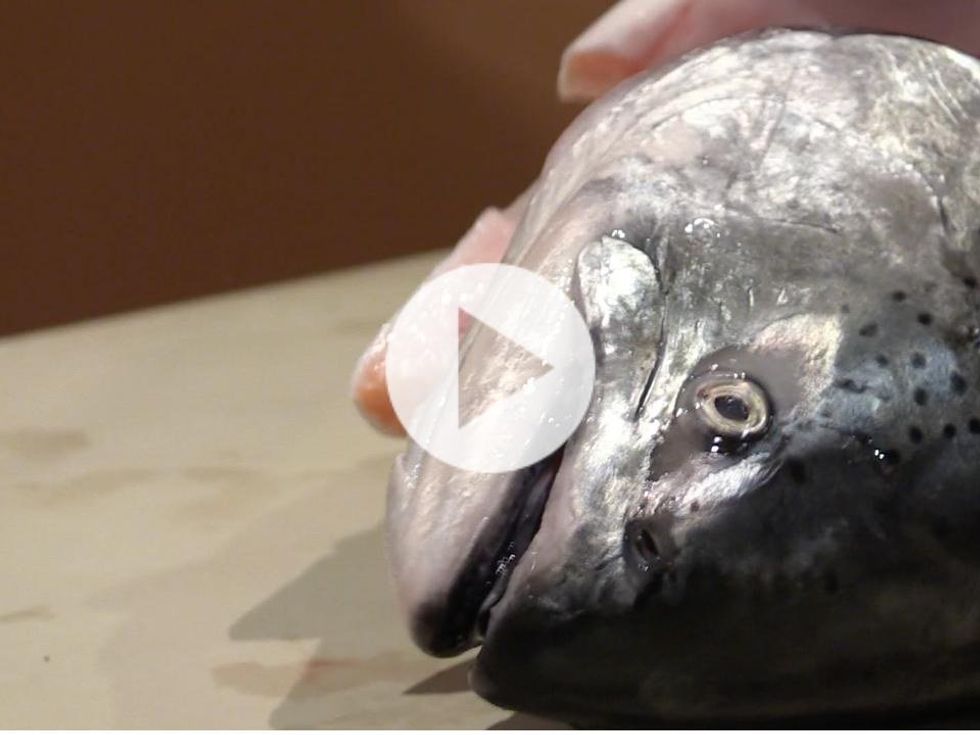 A Bronx company shows off their skills, slicing fish, at a local vendor show.