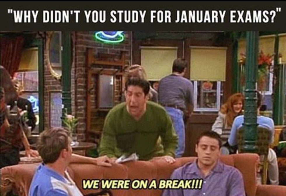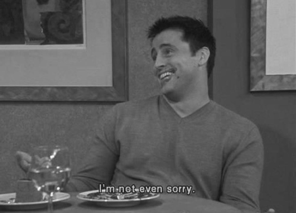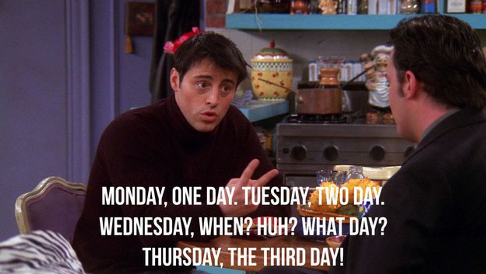 Most of us grew up watching Friends-- maybe with our parents or on our own, but who would of thought that the show would become relevant to a college student's life. There are so many memorable quotes to choose from-- Chandler's witty sarcasm, Joey's child-like persona, or Phoebe's thoughtless comments (or are they?) Here are a couple that us college student's can relate to.
