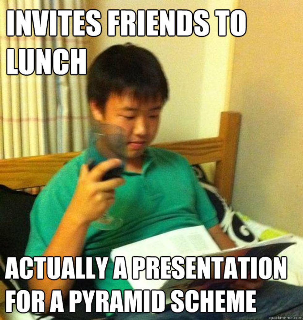 But with that said, an unfortunate trend I've noticed in recent years is the prevalence of pyramid schemes that slide in under the radar with the guise of: Work for yourself! Be an entrepreneur! Work around your own schedule! Be your own boss!