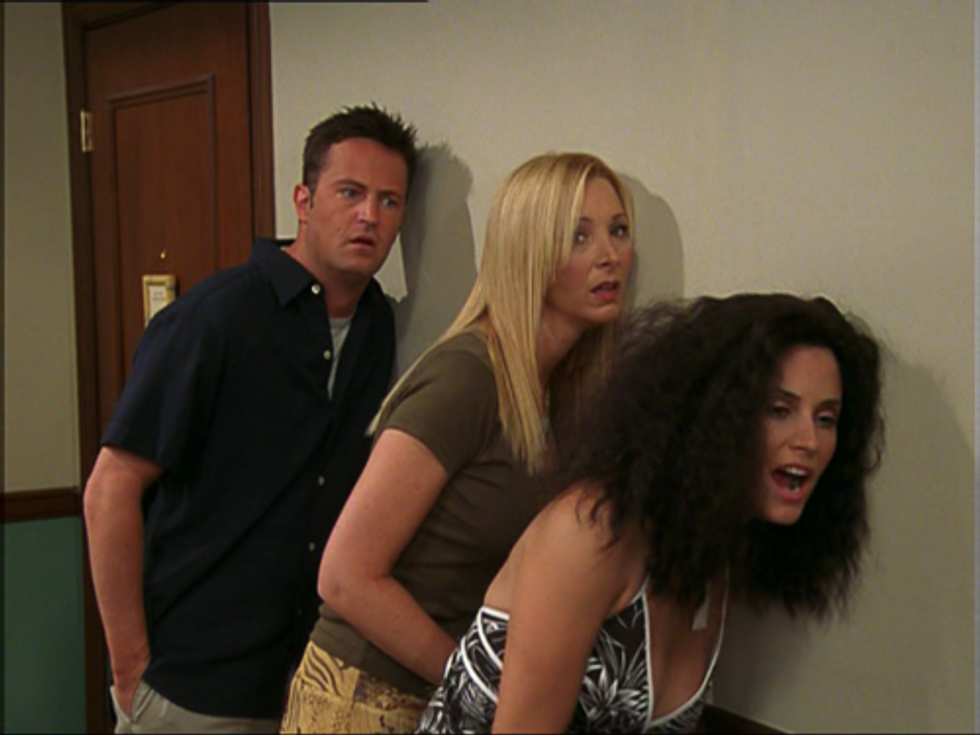 Watching Ross and Rachel fight is not fun, but watching Phoebe, Monica, Chandler and Joey wait out the fight in the bedroom is pretty hilarious.
