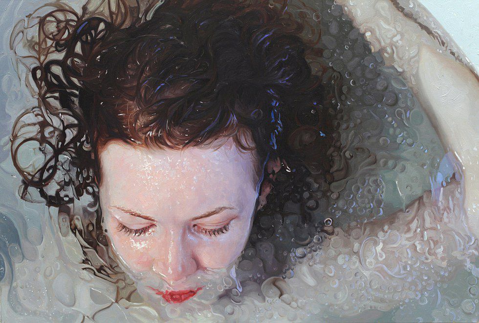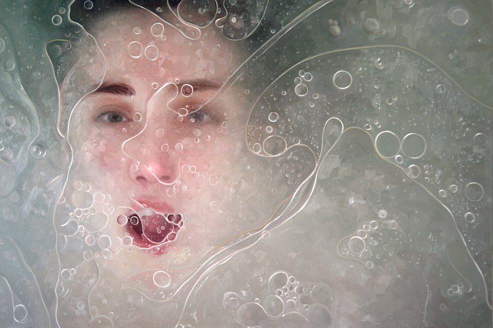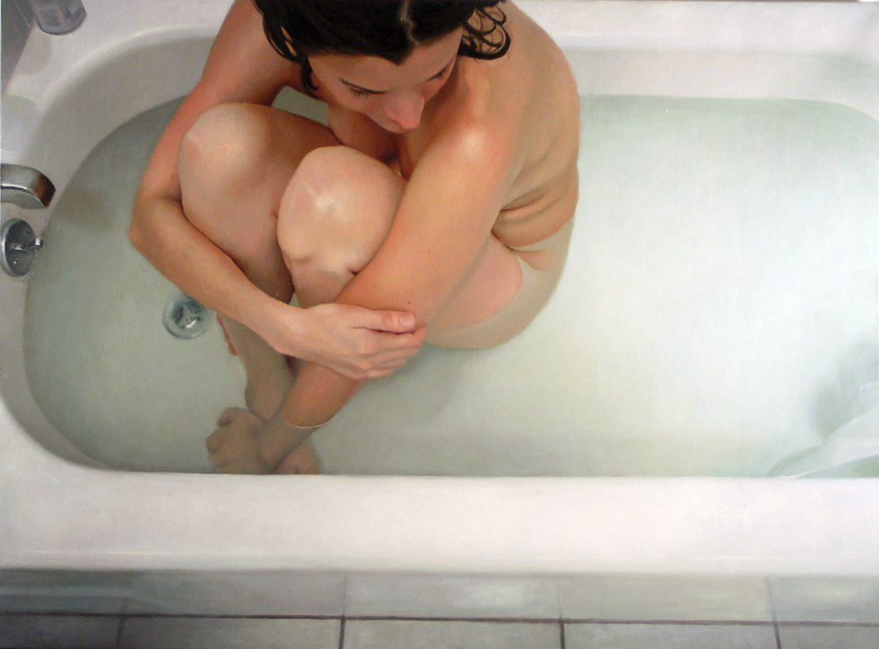 In a painting of a woman in a tub, one of her first of the series, the artist was inspired by a scene from Requiem for a Dream. “It resonated with me,” she stated. “Painting is a sanctuary,” said Monks, and “taking a bath is like that too.” She liked how the water abstracted the image, and said it got her excited. The next phase in her painting was placing a piece of glass in between the subject and the viewer. Monks wanted to know what could be left out of the painting and wanted the viewer to impose their own interpretation to things. She stated, “I wanted people to feel themselves in the painting.” The artist described this process as “learning a different language of how to see."