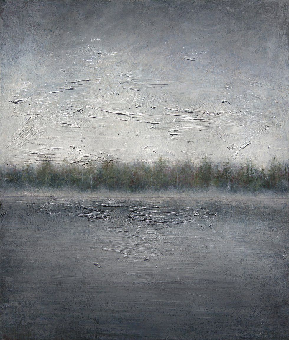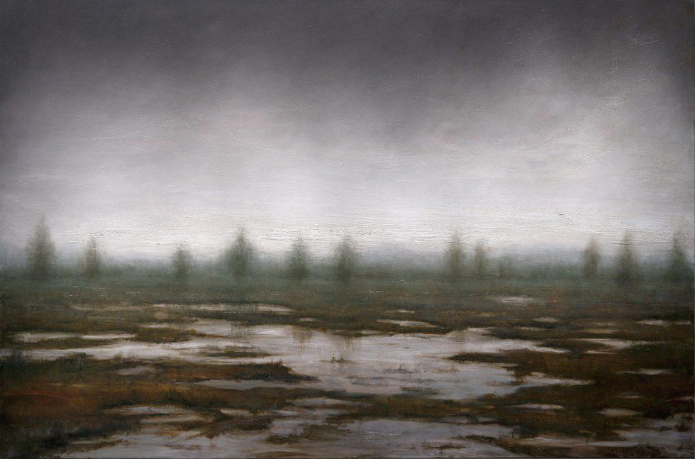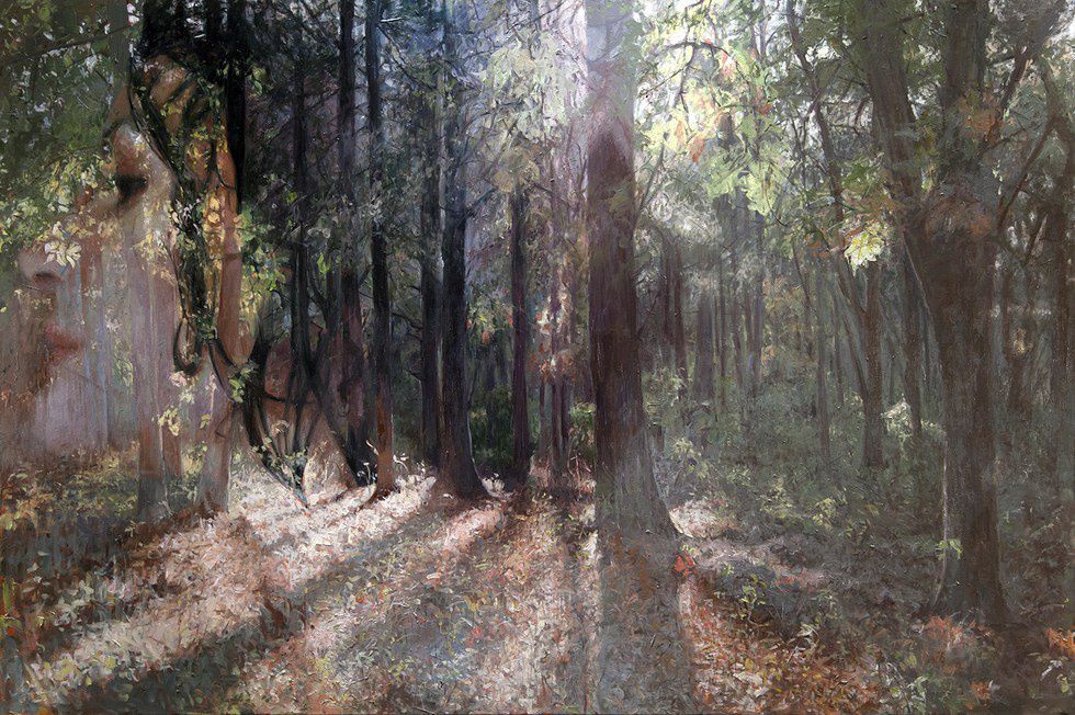 After the loss of a family member, Monks’ work shifted immensely. She stated “everything working up to this point began to unravel.” The artist removed the figure, and shifted from painting primarily interiors to creating landscapes. Monks then thought about painting both landscape and figures, and her new body of work was created. On this difficult process of combing the two, she stated "it's super fun, but super hard.”