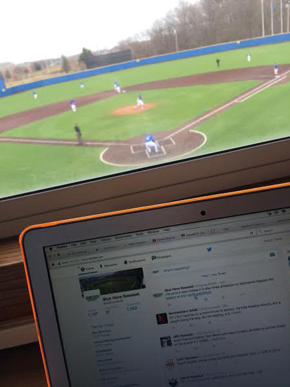 Another unanticipated turn of events: I would be managing the Blue Hen’s twitter account, a task I imagine did not exist at baseball’s start. On my first day in the box, I naively thought I would meet all of the players and my face would be one prominently associated with the team. If you don’t intentionally look for names and faces in the press box, do you really know who’s up there? A thought I never before considered, as Phillie’s announcer Harry Kalas is one of my heroes in the sport. So no, not a single player knew I was up there, and not a single player would for the remainder of the season. I was, though, promised an introduction with the coach. This, however, fell through, as he was not in the best of moods -- if only they hadn’t lost my first game. Putting my eagerness to meet new people aside, I adjusted quickly to the insane busyness that takes place in a room no larger than a large bathroom: there’s me -- the self-appointed social media ambassador -- the announcer, the stats keeper, the guy who runs the scoreboard, the kid in charge of music, occasional members of the grounds crew, unwanted entrance of athlete’s parents (yes, this happens on multiple occasions), and, on a good day, the entire live stream/broadcast/web announcer/multimedia team and all of their equipment. Not to mention a handful of each position from the opposing team. A tight fit, nonetheless.