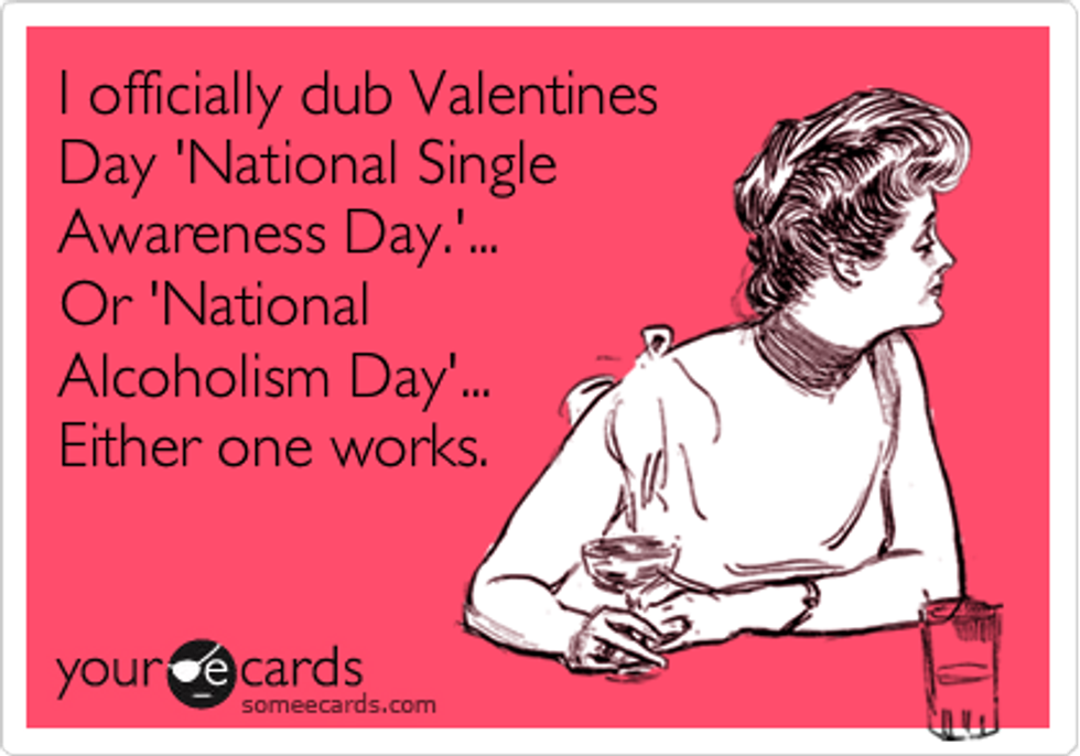 It is perfectly okay to be single on Valentine's Day and in my opinion a lot more fun and entertaining. I spend my money on me and I do not have to stress going though three different stores to find the perfect gift for a guy who isn't even going to appreciate it that much. I would much rather be that one girl in Hooters shredding her ex boyfriend's picture to get free wings than having to dress up to wait two hours for a fancy meal with a boring conversation.