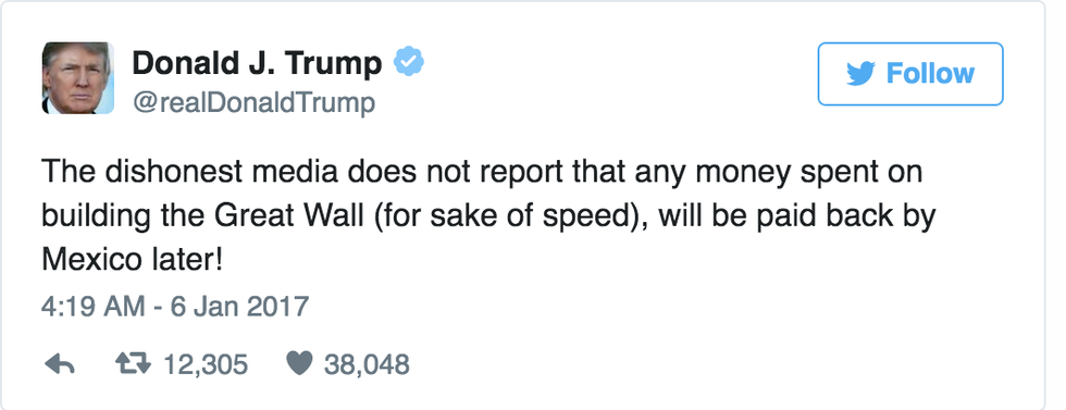 However, Trump took to twitter Friday morning in a defensive effort by criticizing the media and reassuring his supporters "[the wall] will be paid by Mexico later!"