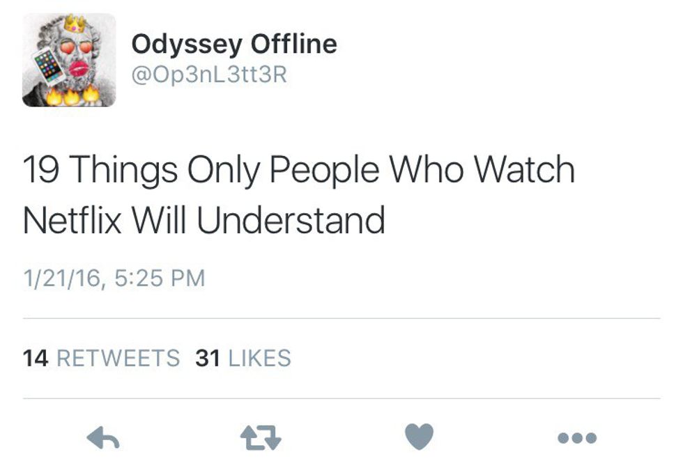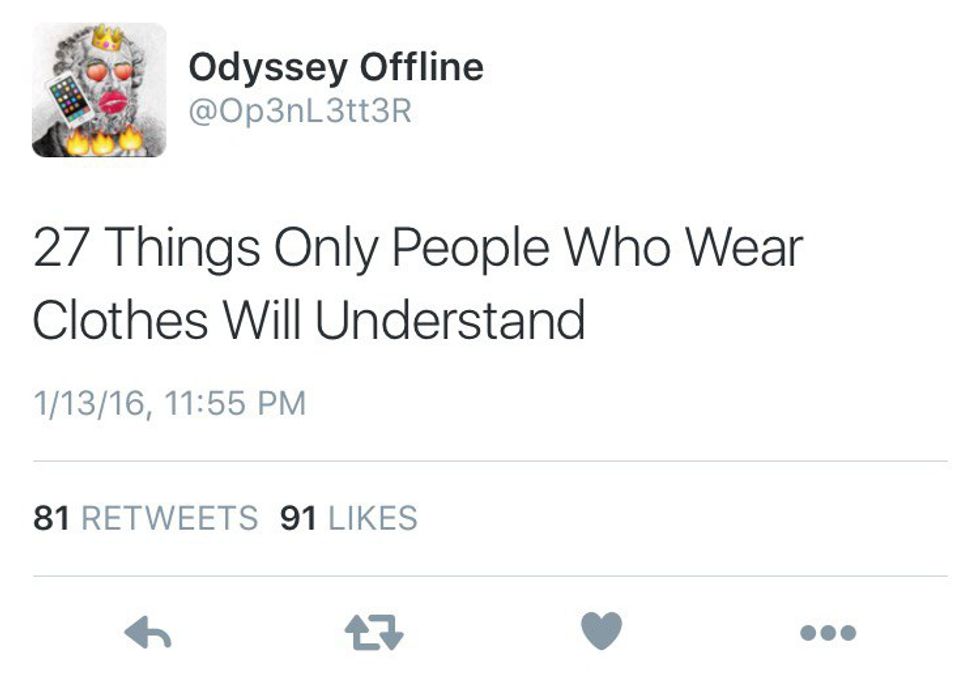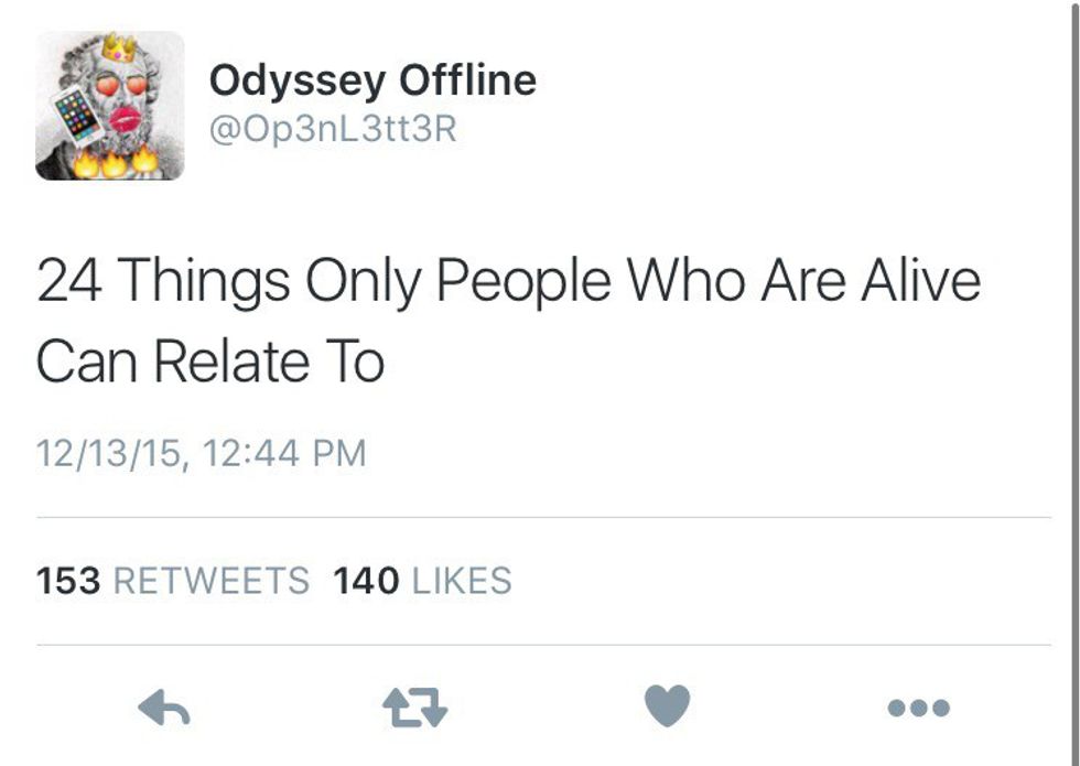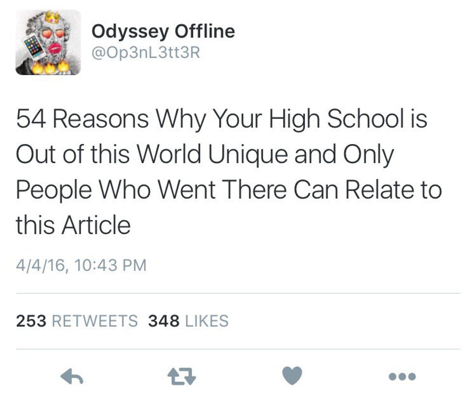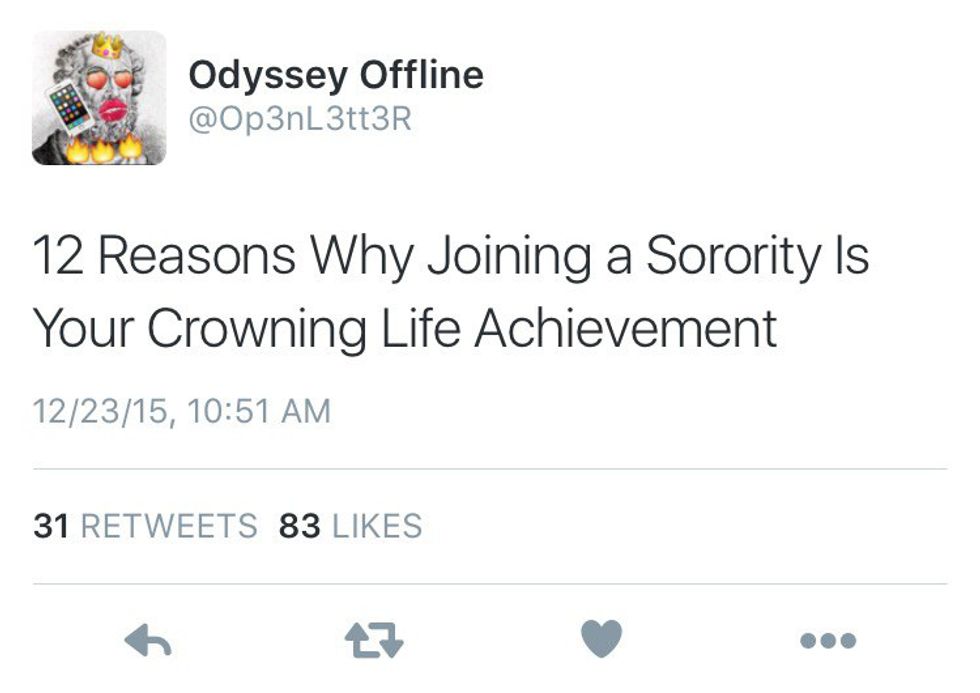 What I'm saying is, these tweets may be funny, but if you've ever read/judged more than one or a few Odyssey articles, you would know that they aren't actually like any of the above. I believe that many Odyssey writers are talented and make some kind of impact in this world. Some articles are silly, some are funny, some are powerful, but that's the beauty of writing. The bottom line is: just laugh at how ridiculous these tweets are, but also understand the Odyssey is way more than lists and open letters and sorority stuff; it's a way for millennials to connect to other millennials and read about topics they are actually interested in. And if this twitter account is so invested in us, we must be onto something.