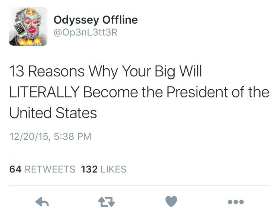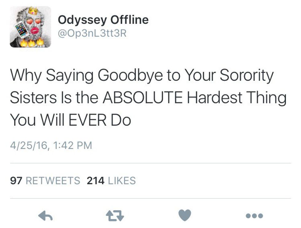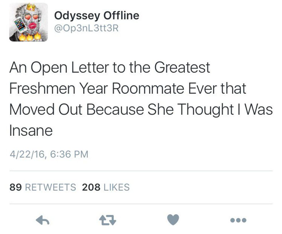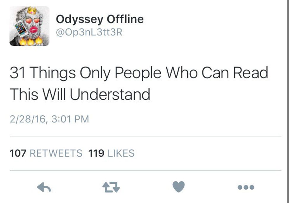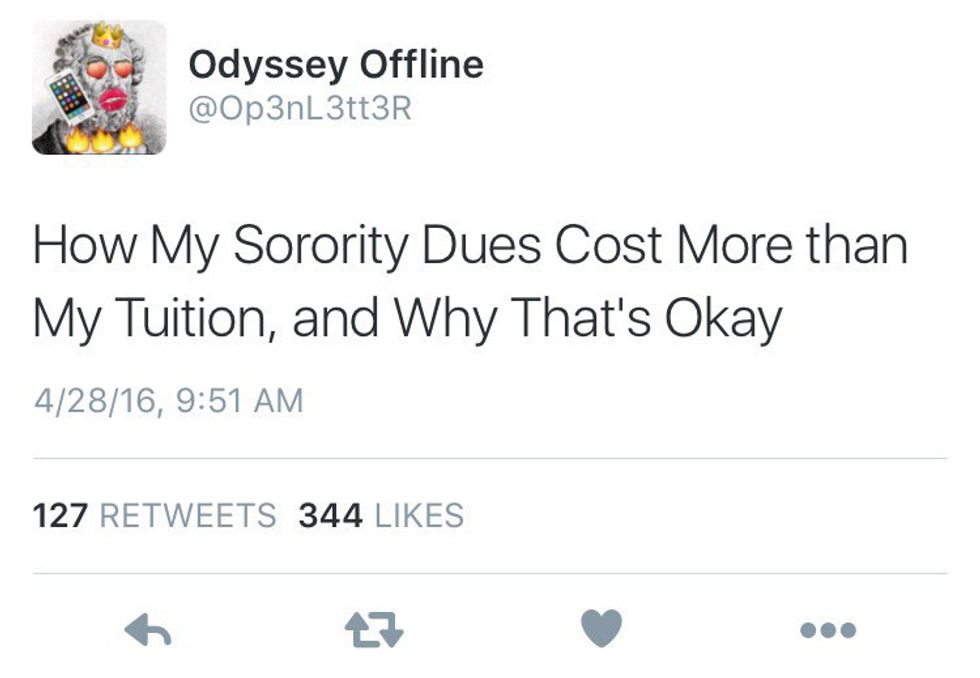 What I'm saying is, these tweets may be funny, but if you've ever read/judged more than one or a few Odyssey articles, you would know that they aren't actually like any of the above. I believe that many Odyssey writers are talented and make some kind of impact in this world. Some articles are silly, some are funny, some are powerful, but that's the beauty of writing. The bottom line is: just laugh at how ridiculous these tweets are, but also understand the Odyssey is way more than lists and open letters and sorority stuff; it's a way for millennials to connect to other millennials and read about topics they are actually interested in. And if this twitter account is so invested in us, we must be onto something.