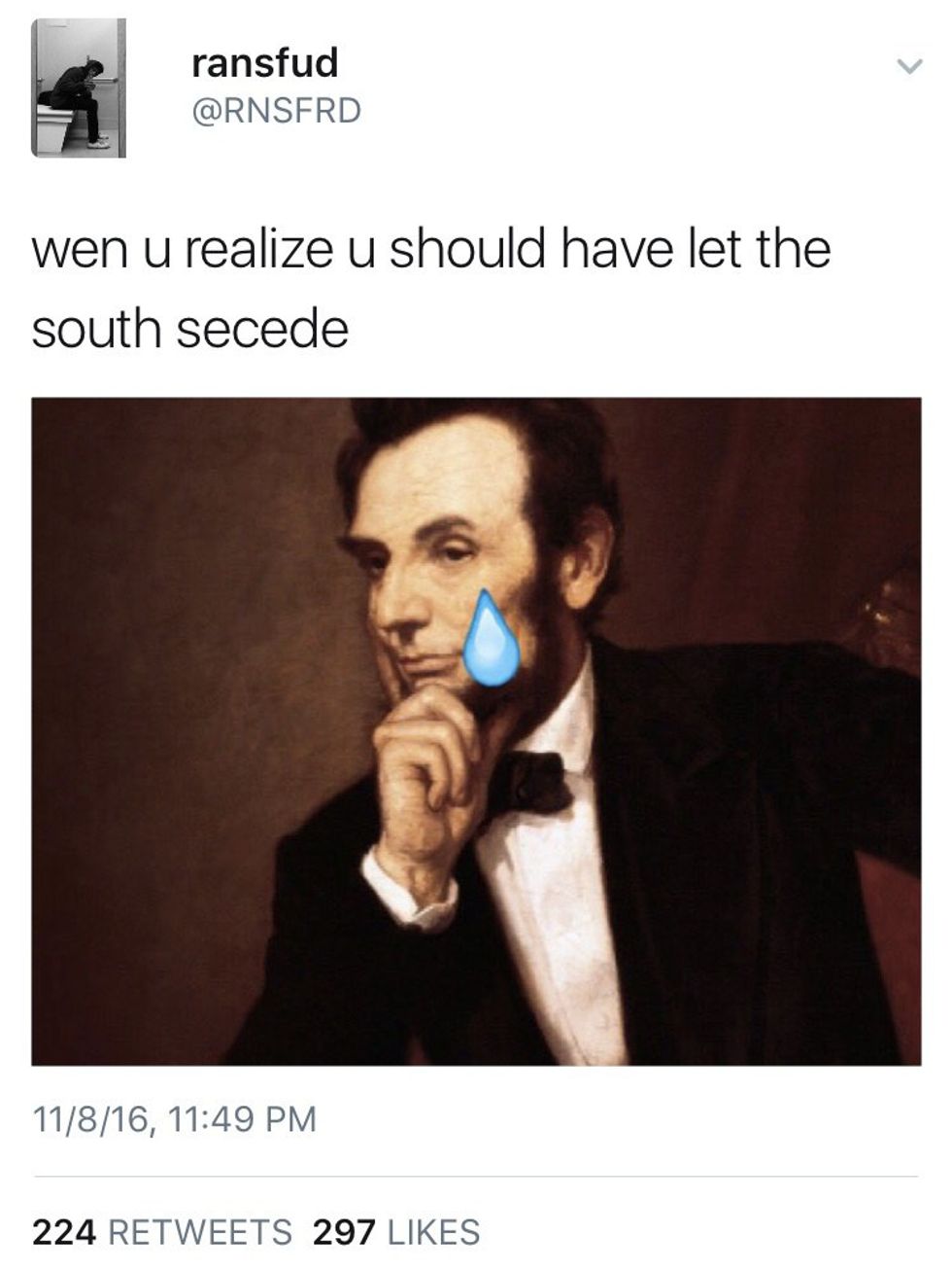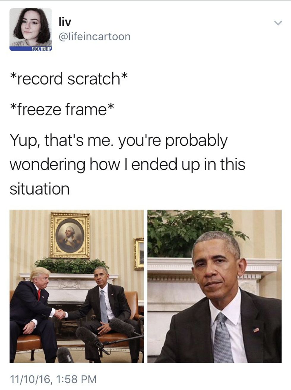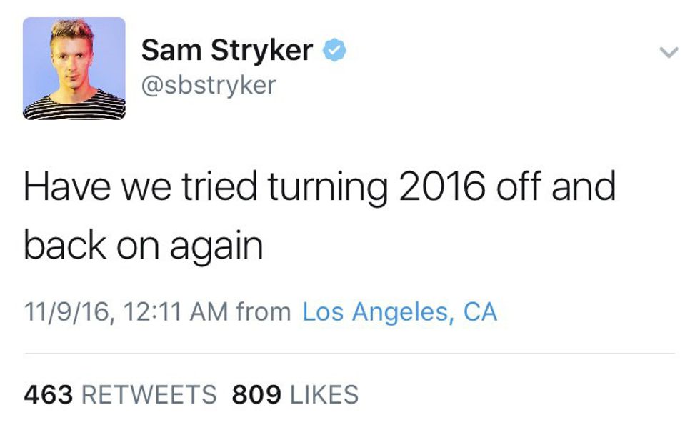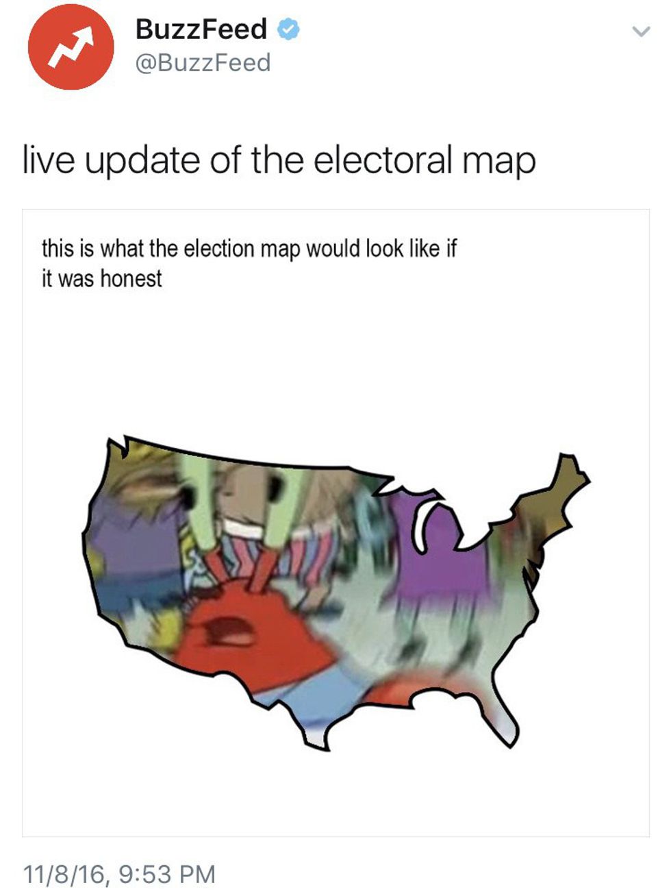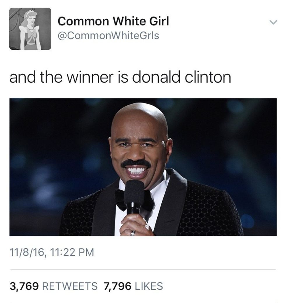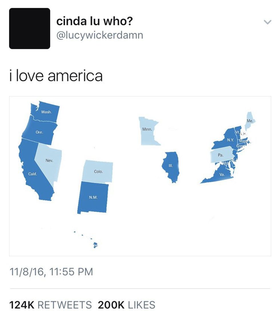 As we all have observed in our personal lives and the news, the results of last week's election are not being taken lightly, to say the least; protests have erupted across the country all the way from New York, NY to Portland, OR, many reports of discrimination toward women, minorities, and members of the LGBTQ+ community are surfacing, and people are taking their opposition to social media platforms. Usually, I would write something very political and opinionated regarding the current events in our country; however, I am so taken aback by everything that has occurred in the past week that I need more time to recuperate and get myself together. The only bright side to this whole situation is people of the Internet have spent the past week creating ridiculous tweets and memes regarding the results. Have yourself a well-deserved laugh and take a look at some of the best ones!