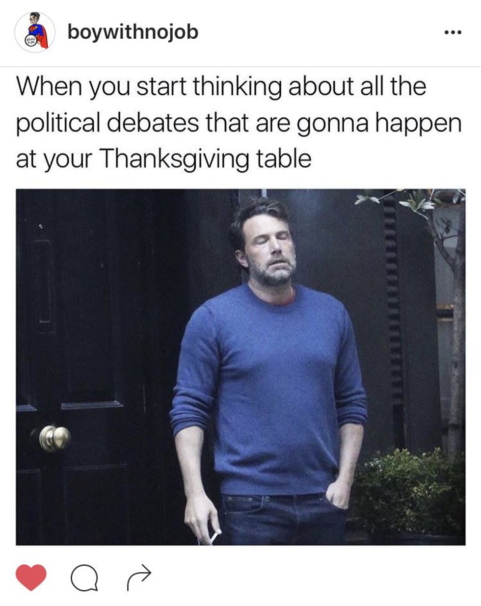 "Hey, could you pass the turkey? Also, how dare you for voting for him!"