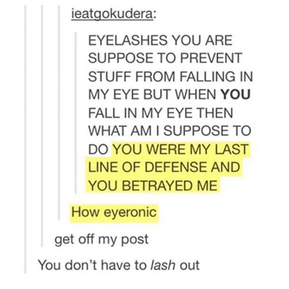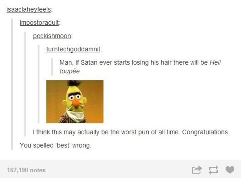 Ah, puns, the spice of life. People may try to tell you that they aren't funny or that they are cringe-worthy, but don't let them bring your punny self down. I don't know about you guys, but lately I've been in a funk and sometimes I feel like I just need a good laugh. If your sad, happy, or somewhere between hopefully this will help you out.