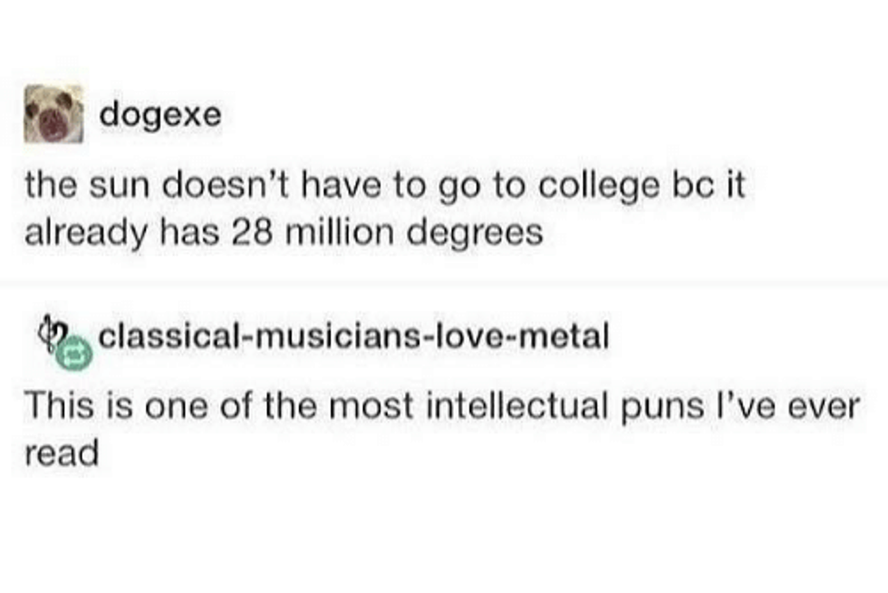 I hope you got a chuckle out of these. Puns are definitely a lost art form, so feel free to google more and bring them back. Now go impress your friends with your knowledge of puns... you KNOW you want to.