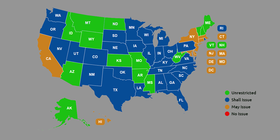This map shows the gun carrying policies in all 50 states as of 2017. Think about it.