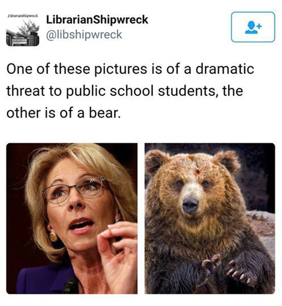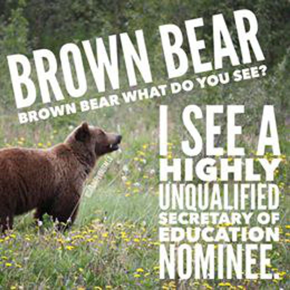 Finally, her stance on guns in schools is laughable at best. Personally, I can stand behind the idea of highly trained resource officers or, in less funded schools, highly trained teachers having a gun or two in the school to protect students, but DeVos didn’t even make that argument in her hearing. She stated: "I would imagine that there is probably a gun in the schools to protect from potential grizzlies." THINK for a moment. How many grizzly bear attacks have you heard about happening in schools? I can’t think of a single moment. Seriously, DeVos? Do you even have a brain settled in that skull of yours?