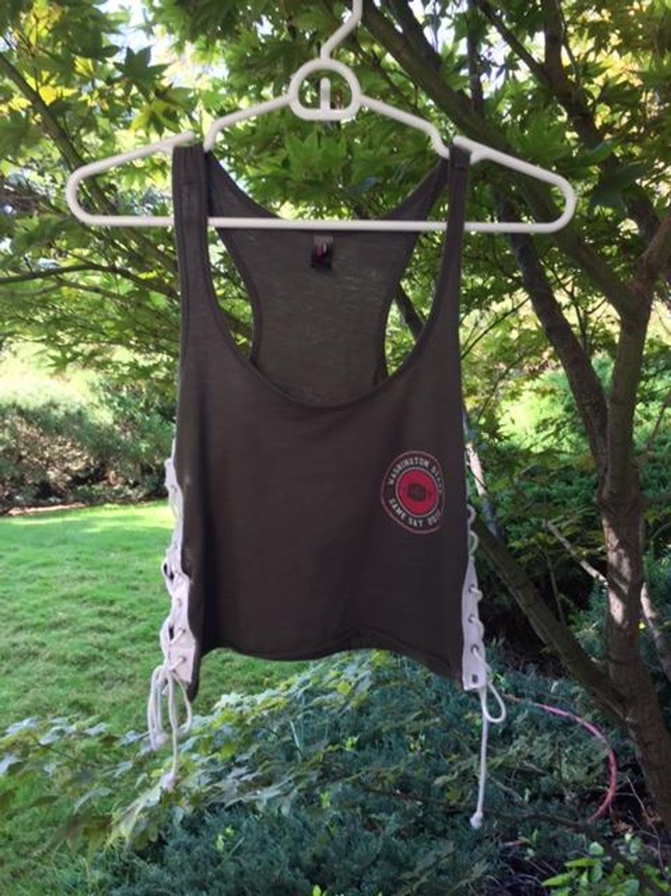 - At the seam between the collar and what’s left of the sleeve (which should be a thick tank), start to cut a razor-back curve ONLY on the back side. Again, once you cut this out, put it over the other side for a symmetrical look.
