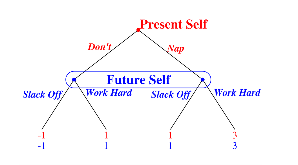 In this game, there are two players: your present self and your future self. Each player has two possible actions: Player 1 can choose to nap or not to nap, and Player 2 can choose to work hard or to slack off.