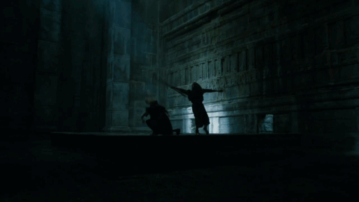Flash to the next scene of Sansa and Theon running through the woods away from Winterfell and towards the North. Which brings us to our first epic fight scene of the episode. Ramsay Bolton's "best men" find the two escaping, but are sh*t out of luck when Lady Brienne of Tarth and her temporary sidekick, Podrick, step up on scene and take charge. Look who's about to be the new favorite foursome.