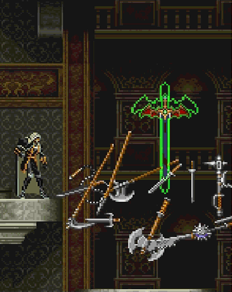 I'll come right out and say it, SOTN is one of my favorite games ever. I'd easily place it in my top 10 games for a myriad of reasons. Composed by industry veteran Michiru Yamane, SOTN boasts a wonderfully diverse soundtrack that ranges from classical (here's one of my favorites) to hard rock, to smooth jazz. For a game that came out in 1997, the visuals hold up beautifully. The Gothic art direction is backed up by incredibly well animated 2D sprites (see below).