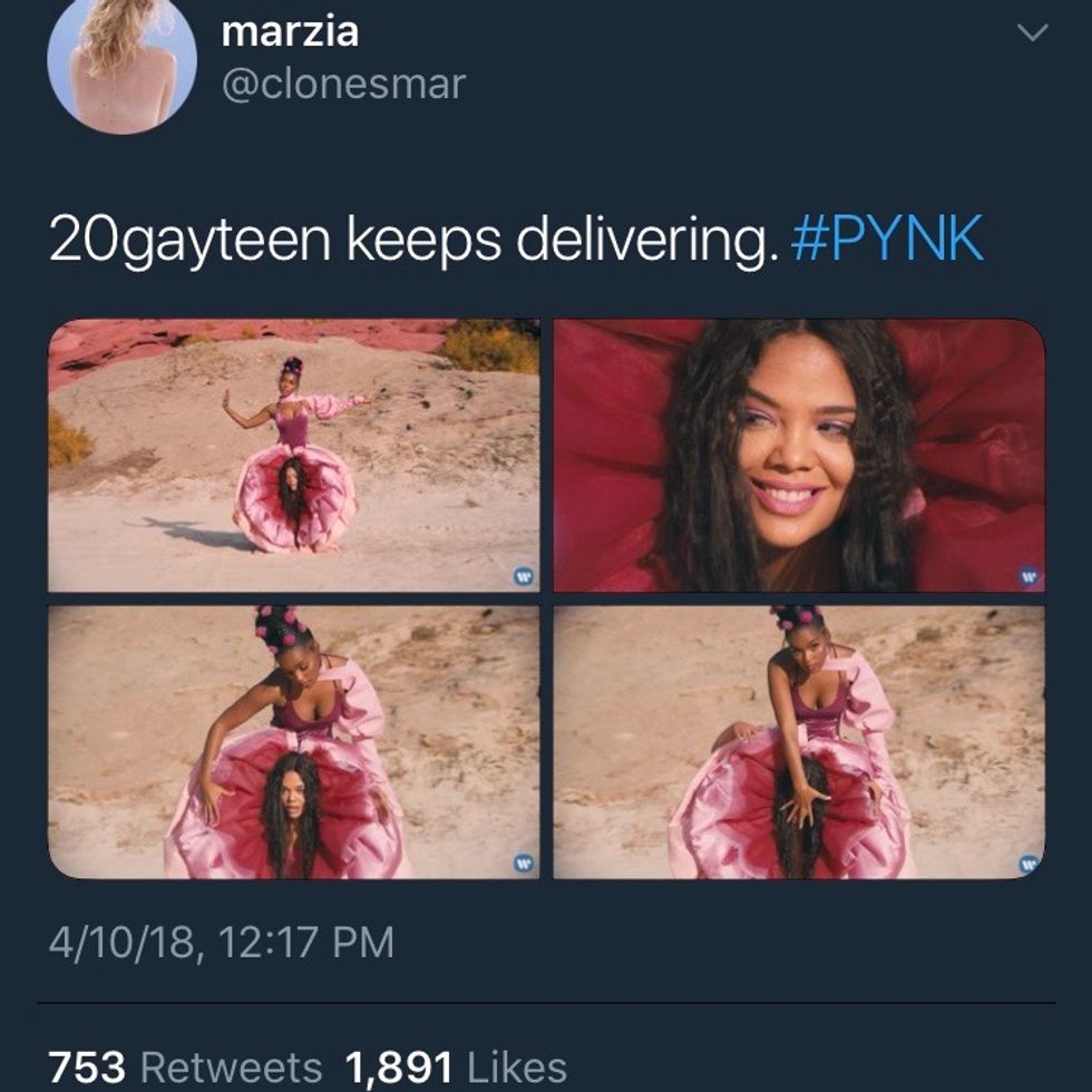 Janelle Monáe did not come to play in 20gayteen. She dropped the music videos for "Django Jane" and "Make Me Feel" on the same day. "Make Me Feel" becoming instantly a bisexual anthem as she portrays a love triangle where her two interests are of opposite sexes and "Django Jane" becoming forever iconic as she spits straight bars and pulls of rhyming P*ssy riot with P*ssy diet. On top of that, she recently released "PYNK" which has been claimed as yes another lesbian anthem in which she sings her love for the female genitalia.