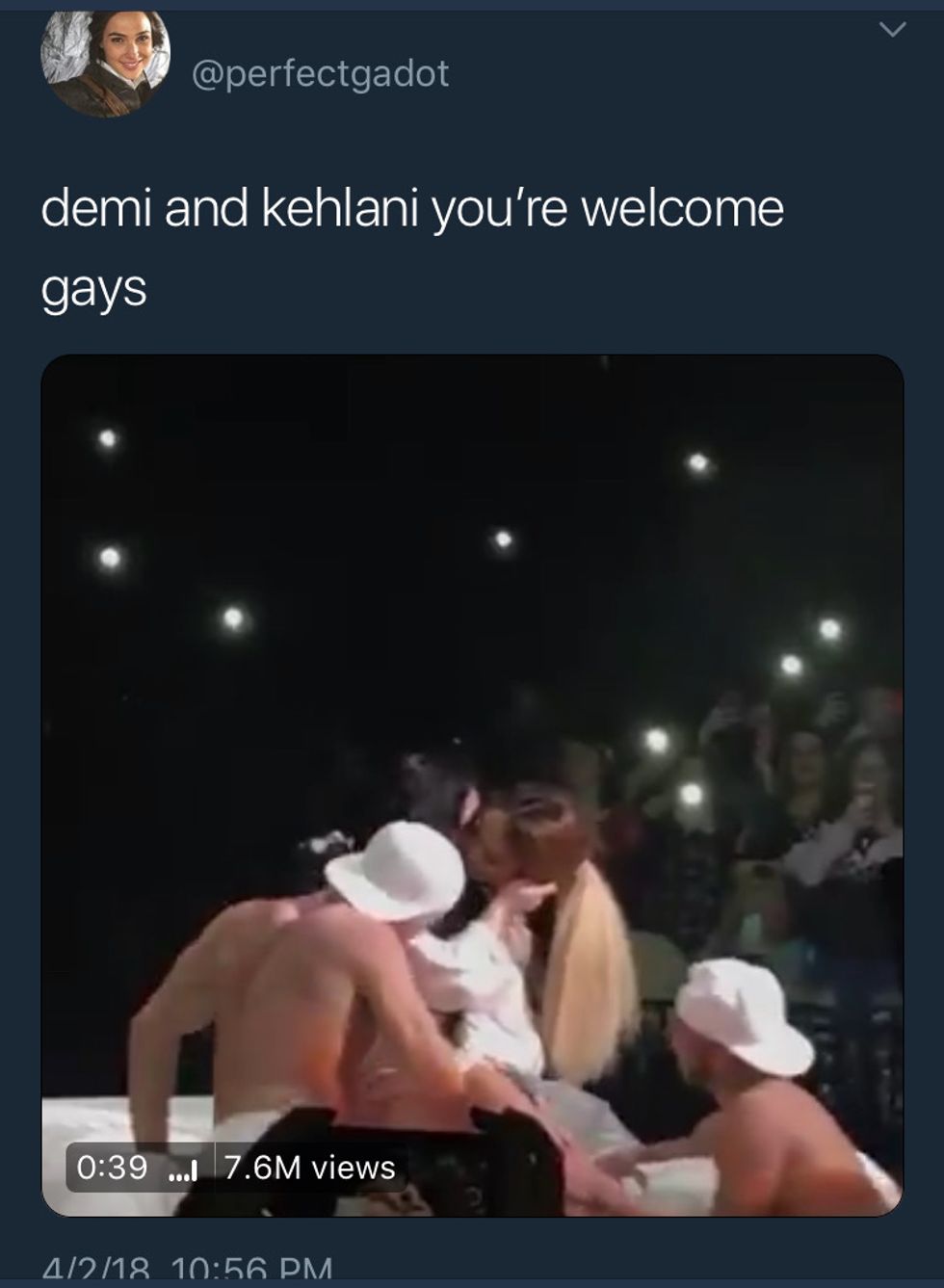 Demi and Kehlani both identify as openly bisexual, during Demi's last set on her TMYLM Tour Kehlani came out onstage as a surprise where the two then shared a kiss and a "sensual" dance. Their stans were overjoyed, to say the least #kehmi and #demlani was given life.