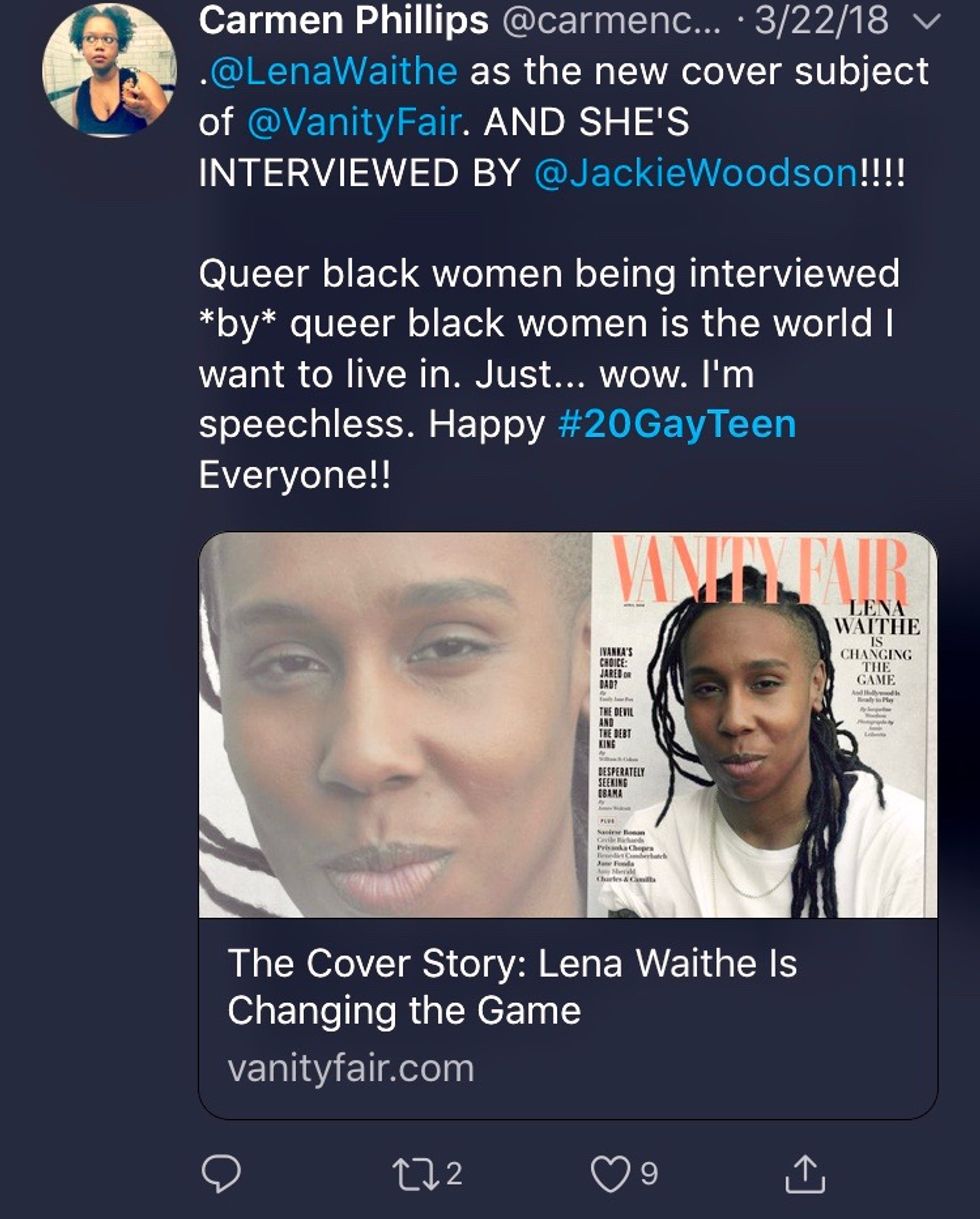Not only was Lena Waithe (actor, producer, screenwriter) on the cover of Vanity Fair but her interview was done by writer, Jacqueline Woodson! Both women identify as lesbian.