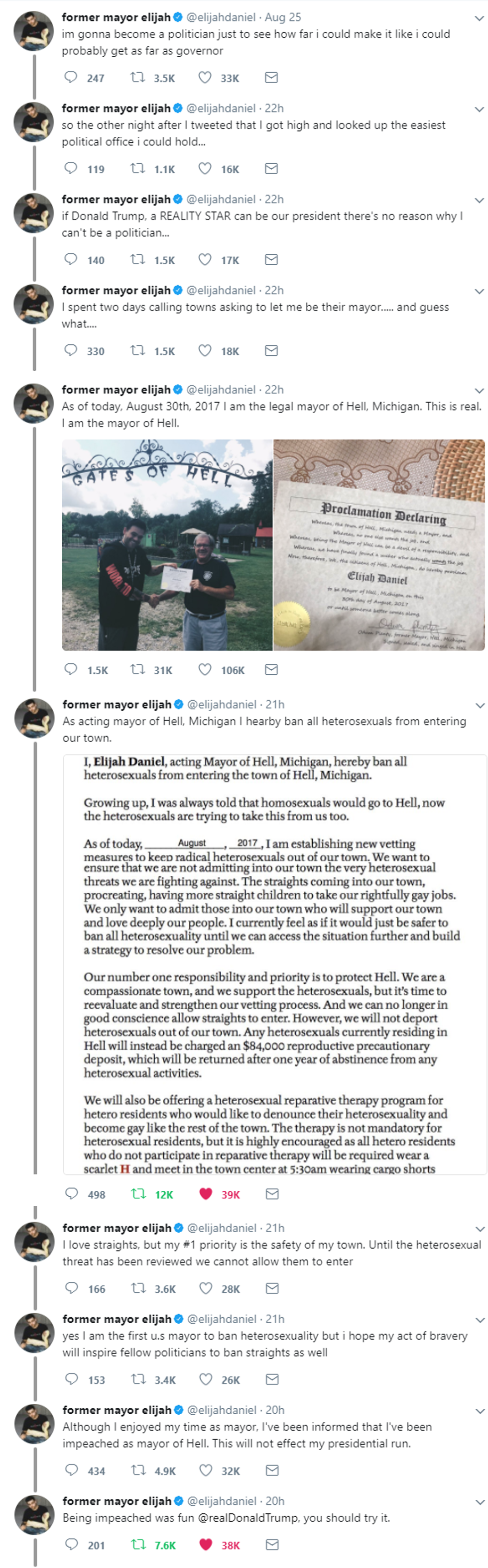 "I, Elijah Daniel, acting mayor of Hell, Michigan, hereby ban all heterosexuals from entering the town of Hell, Michigan.