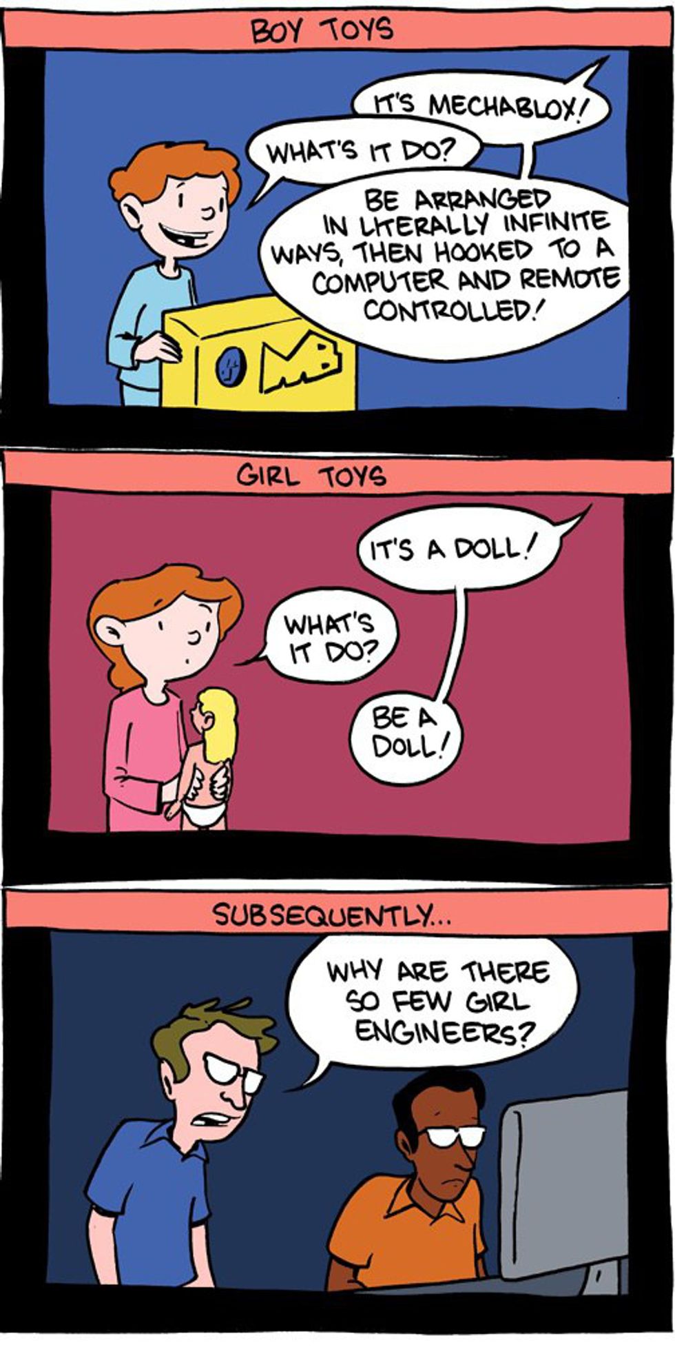 Most toys are gendered, and this can lead to a difference in socialization and interests. From an early age, a majority of girls are taught to play with dolls, bake using their Easy Bake oven, and more. On the other hand, a majority of boys are taught to play with cars, trucks, and Legos. The toys most girls play with either teach them how to care for other people and be homemakers or make them feel like they need to look pretty — aka Bratz dolls and other related toys. The toys most boys play with could end up making them interested in mechanics, construction, and similar subjects. From an early age, most children are raised to be more likely to join one career or another based on what gender they are, and that is not okay. Also, for the girls who want to play with trucks and cars and the boys who want to play with dolls, what’s the big deal? The girl could grow up to fix cars and/or other machines, and the boy could grow up to be a good father. There is nothing wrong with that. However, most of society doesn’t give them that fair chance.