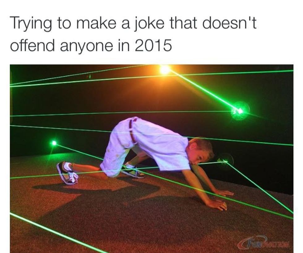 Innocent jokes cannot be made anymore for the sake of sparing everyone else's feelings. People used to be able to breathe air without having someone be offended by it. What happened to two individuals having diverse opinions, and having an educational, civil debate about it?