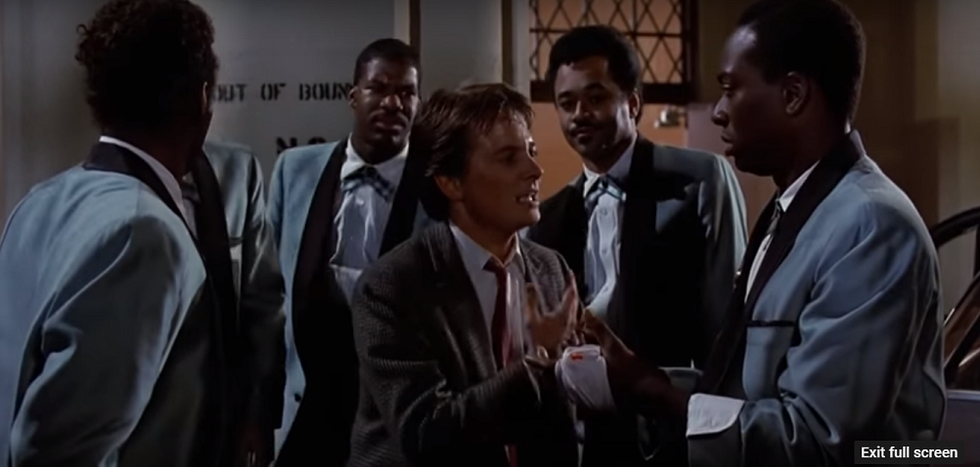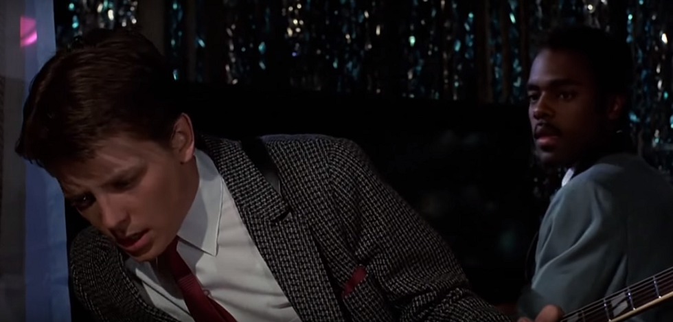 It starts out where one of the members of the band playing the music for the dance slices his hand trying to free Marty from the back of a car trunk he was locked into by Biff’s goons. As a result, he can’t play for the rest of the dance, which poses a problem because as Marty says “if there’s no music they can’t dance and if they can’t dance they can’t kiss and if they can’t kiss they can’t fall in love and I’m history." Pretty accurate, Marty. So, Marty then begins the scene playing the guitar as a substitute to try and save the day. But, not before other things start to go wrong (of course).