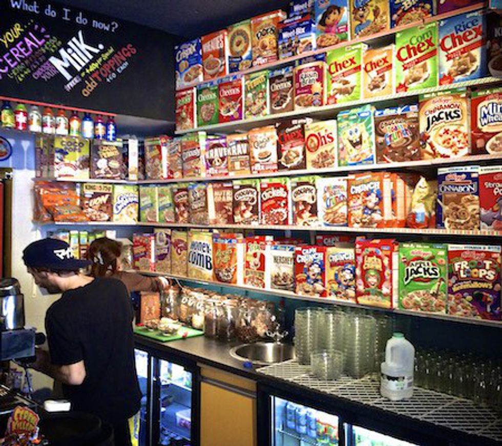 Chances are everyone's love for cereal is deeply ingrained in them from leisurely spent Saturday mornings in front of the television in their childhoods. I remember looking forward to Saturday morning cartoons with a bowl of Honey Bunches of Oats in hand when I was in elementary school. Since then, free Saturday mornings have become few and rare, but in Shoreditch's Cereal Kller Cafe nostalgia runs high and you can relive your childhood over a bowl of your favorite sugary cereal. Although a sugary morning isn't everyone's prime choice of breakfast as they get older, there is no denying the infallible attraction of Cereal Killer Cafe's ambition to invite adults who are kids at heart. However, a little over a year ago Cereal Killer Cafe almost became obsolete when a radical political group named Class War staged a violent protest and defaced its storefront. After visiting this morning and reliving a bit of my childhood, I couldn't imagine why anyone would do such a thing.